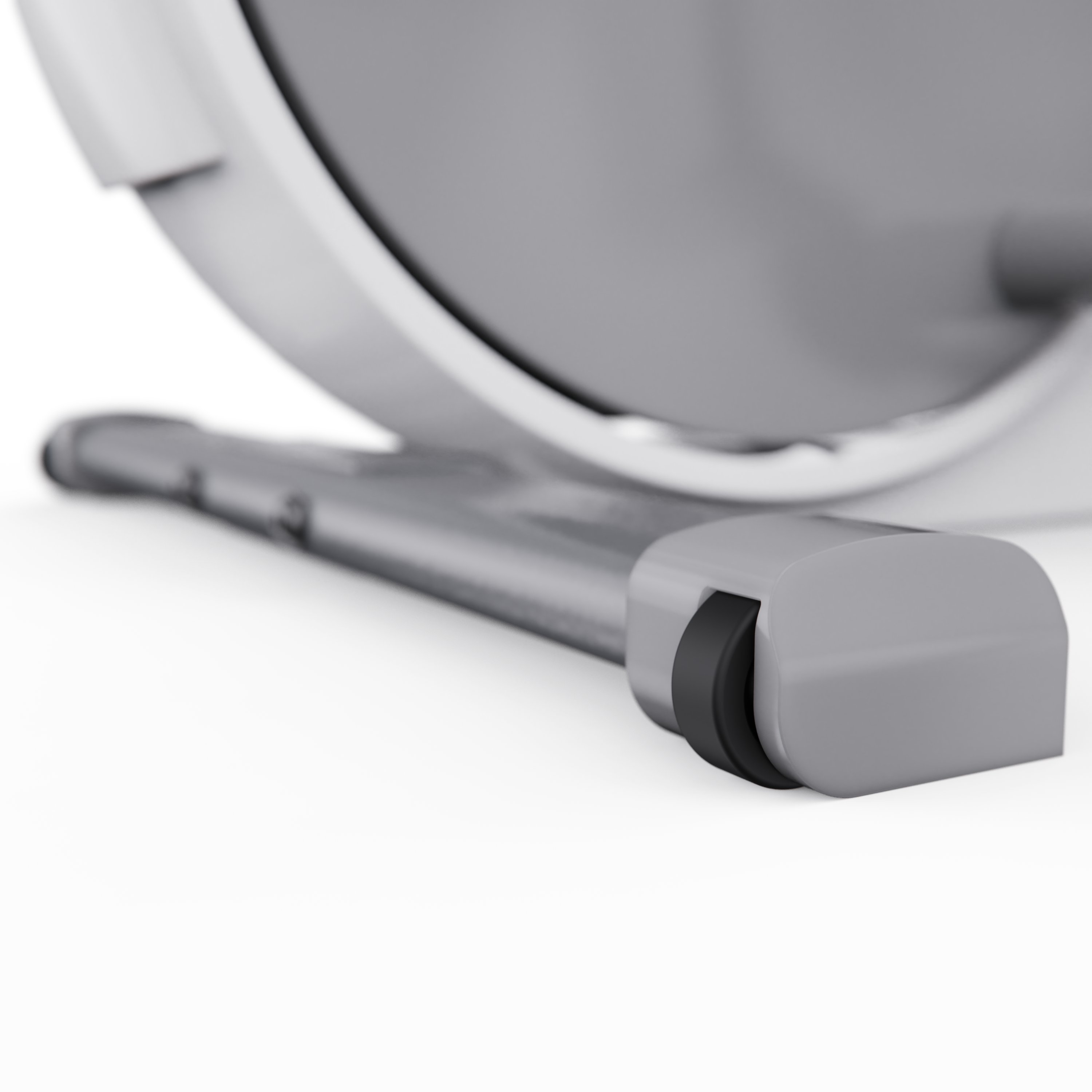 Одним из ключевых преимуществ тренажёра является его складная конструкция. Это особенно удобно для использования в квартирах или небольших помещениях. Такой компактный эллиптический тренажёр впишется даже в ограниченное пространство. Для удобного перемещения предусмотрены транспортировочные ролики, а компенсаторы пола позволяют установить тренажёр ровно даже на неровной поверхности.