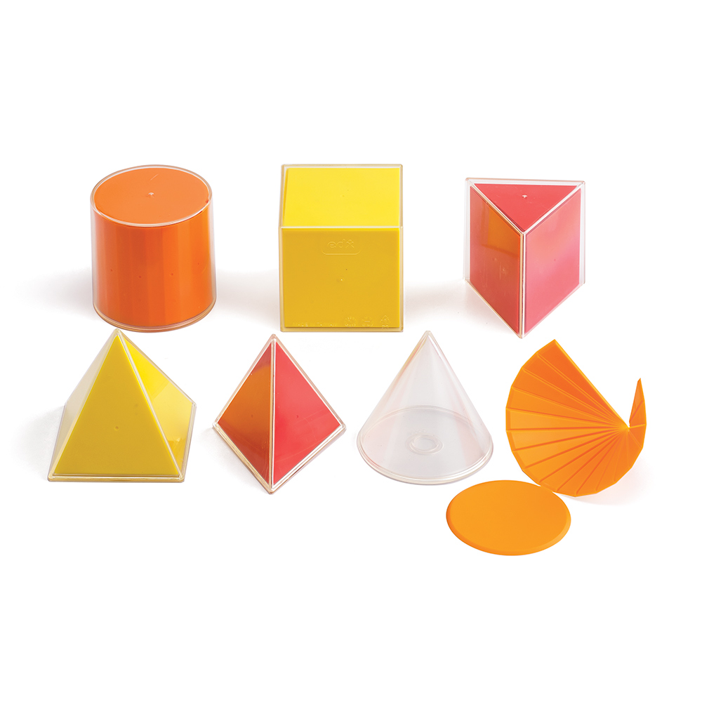 Набор состоит из 6-ти твердых тел из прочного пластика с закругленными углами и краями и 6 соответствующих им складных форм 3-х цветов из мягкого пластика.