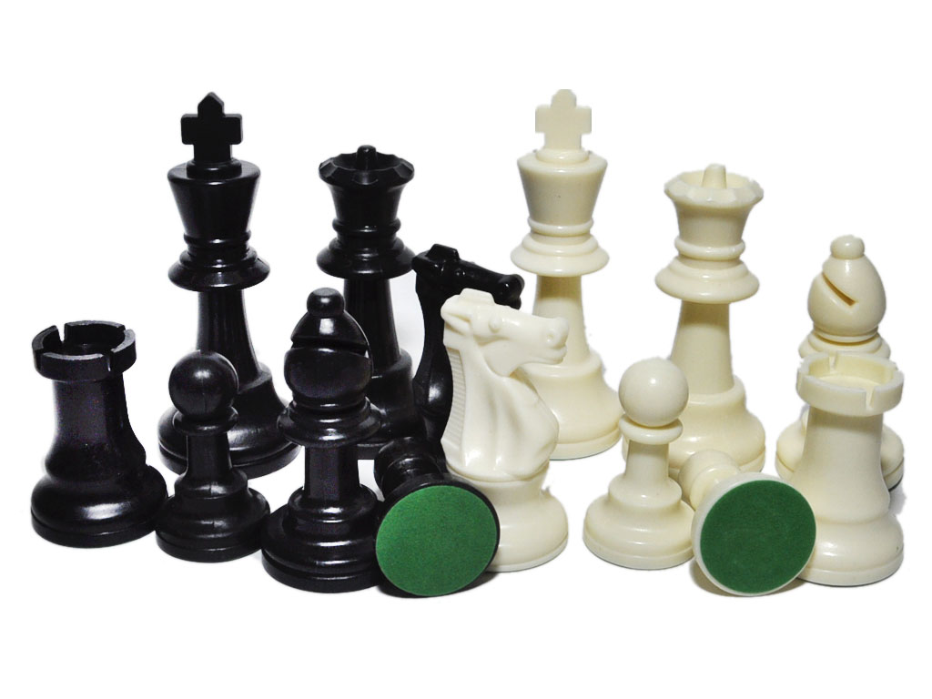 Комплект пластиковых шахматных фигур без утяжелителя матовые. Выполнены из прочного износостойкого пластика. Основание каждой фигуры покрыто зеленым бархатом. В комплекте фигуры белого и черного цвета.