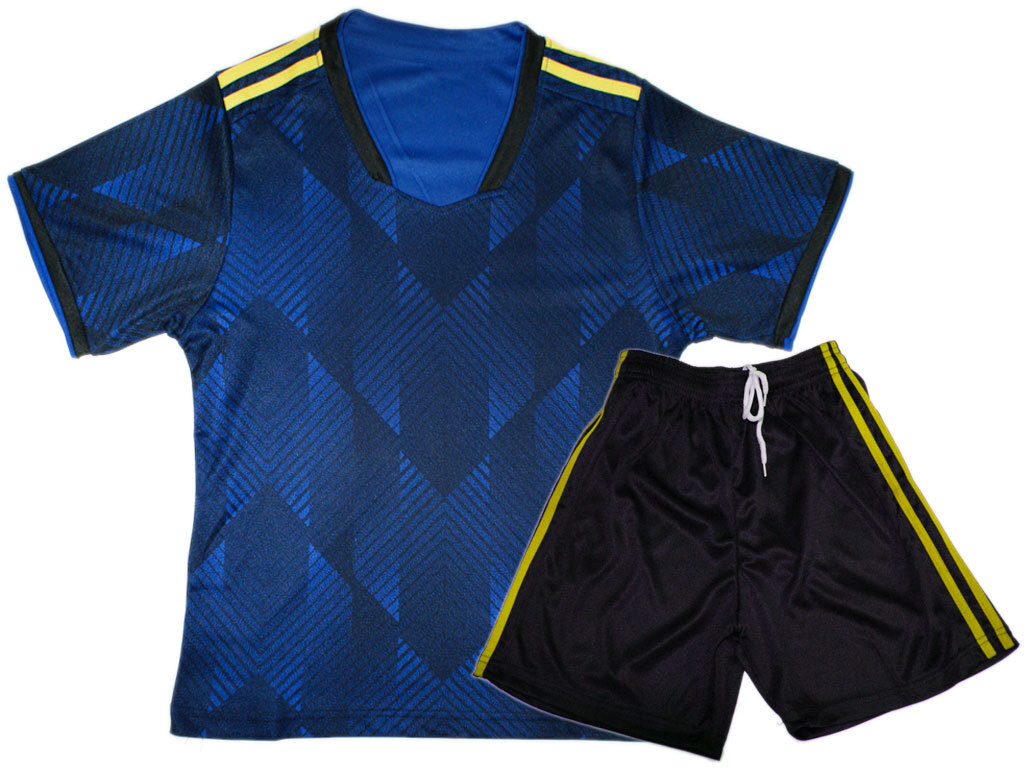 Футбольная форма состоит из классического комплекта, который включает в себя игровую футболку и шорты. Используется как форма для полевых игроков команды. Футболка с коротким рукавом пошита из синего и черного полиэстера с принтом, и круглым вырезом горловины. На плечах полоски из желтого материала, как на шортах. Шорты пошиты из полиэстера черного цвета с тонкими полосками желтого цвета. Благодаря свойствам ткани форма не парит кожу, быстро отводит влагу и прекрасно вентилирует. Быстро высыхает, не требует дополнительной глажки.