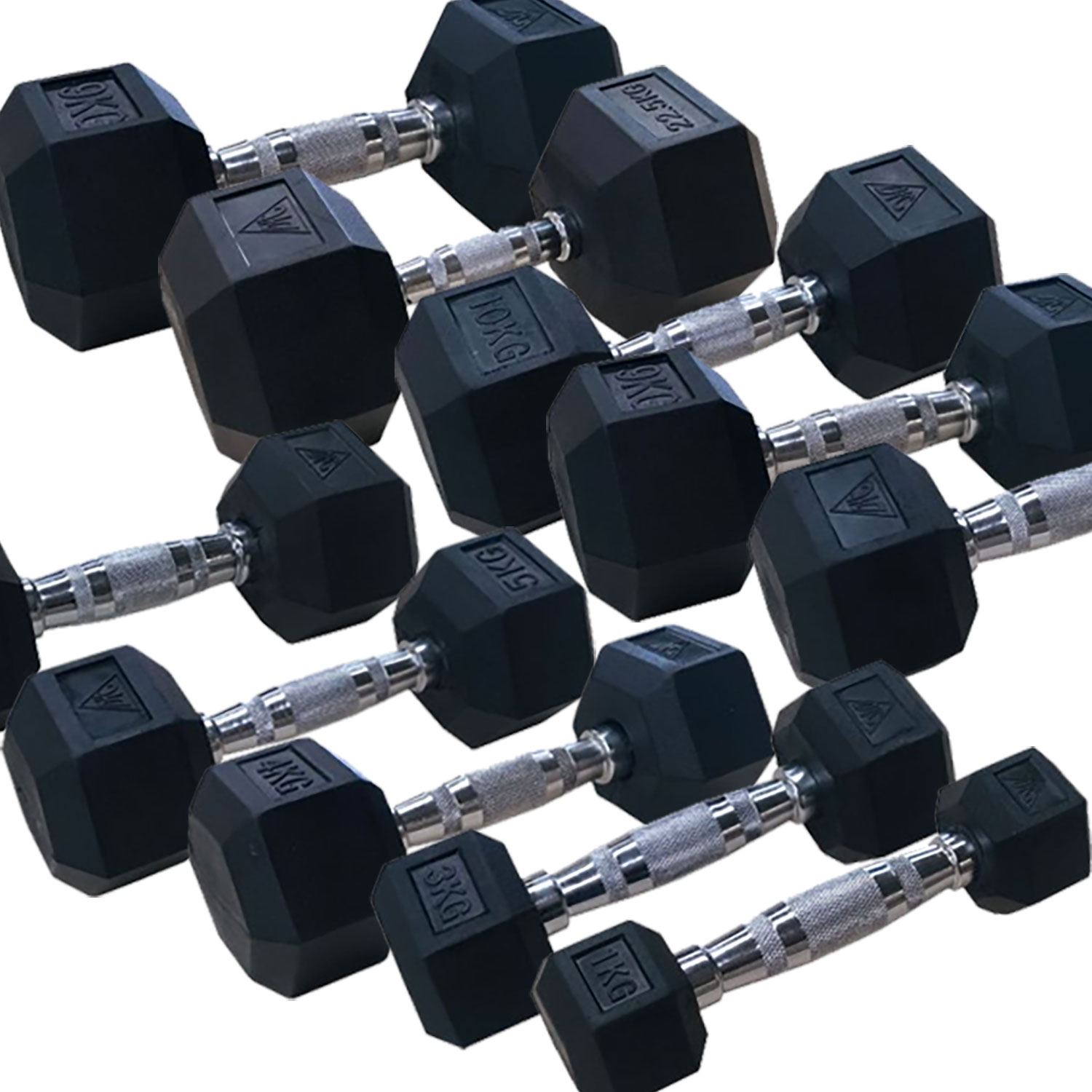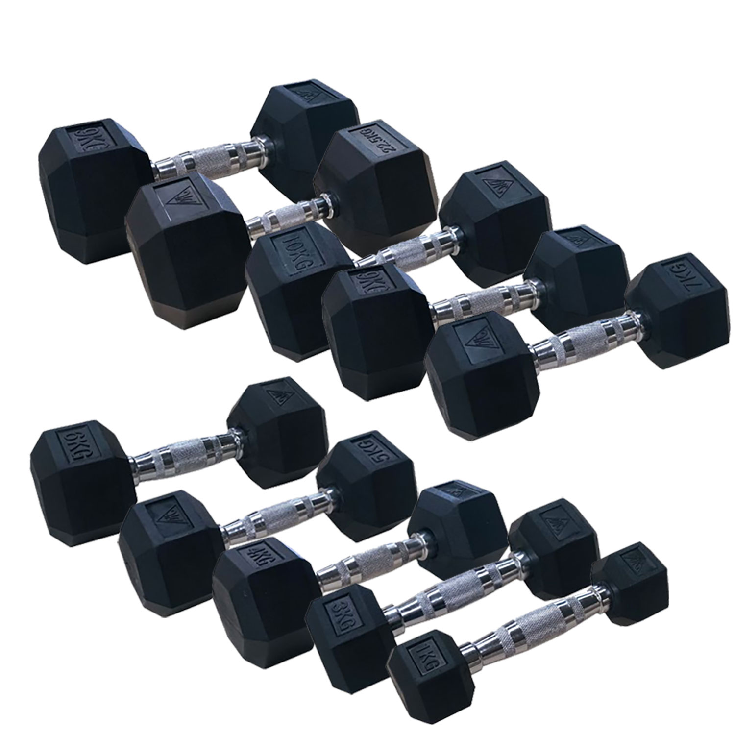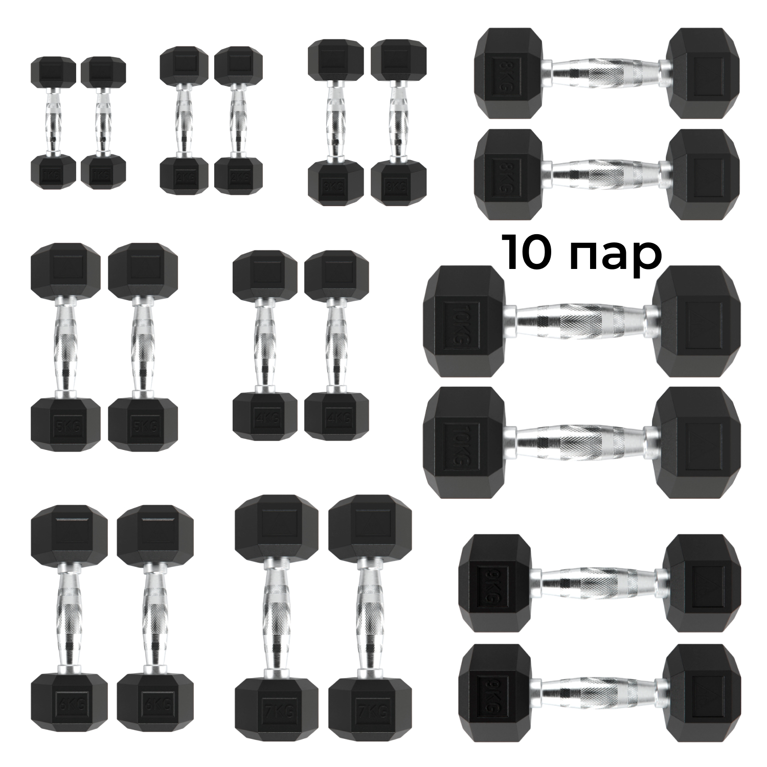 Набор включает следующие гантели: 2 x 1 кг, 2 x 2 кг, 2 x 3 кг, 2 x 4 кг, 2 x 5 кг, 2 x 6 кг, 2 x 7 кг, 2 x 8 кг, 2 x 9 кг, 2 x 10 кг