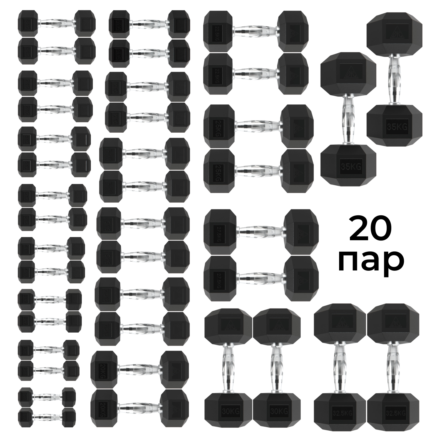 Набор включает следующие гантели: 2 x 1 кг, 2 x 2 кг, 2 x 3 кг, 2 x 4 кг, 2 x 5 кг, 2 x 6 кг, 2 x 7 кг, 2 x 8 кг, 2 x 9 кг, 2 x 10 кг, 2 x 12,5 кг, 2 x 15 кг, 2 x 17,5 кг, 2 x 20 кг, 2 x 22,5 кг, 2 x 25 кг 2 x 27,5 кг, 2 x 30 кг, 2 x 32,5 кг , 2 x 35 кг