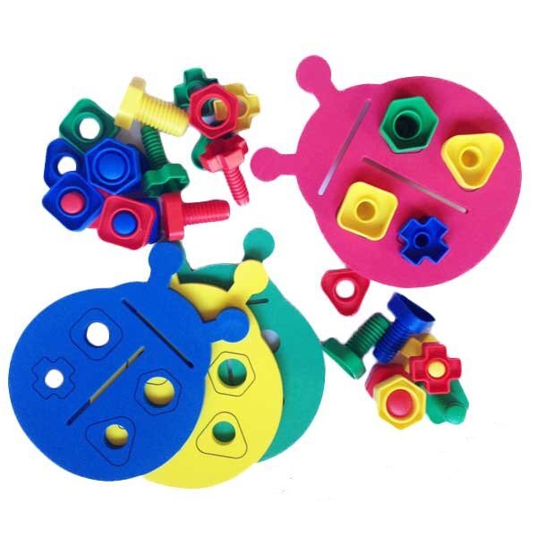 - 16 пластиковых гаек и 16 болтиков, выполненных в 4-х разных формах и 4-х цветах (шляпки болтиков и гайки имеют форму разных геометрических фигур: треугольник, квадрат, шестиугольник, крест); диаметр гаек - 4,5 см, длина болтиков 6 см;