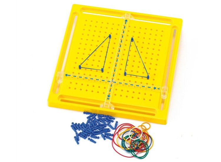 Планшет имеет две подвижные линии - оси-симметрии X-Y. Используя колышки и резиновые ленты, входящие в набор, дети могут выполнять различные действия: строить геометрические фигуры, коническую секцию и линейные сегменты., создавать изображения различных предметов и животных и др.