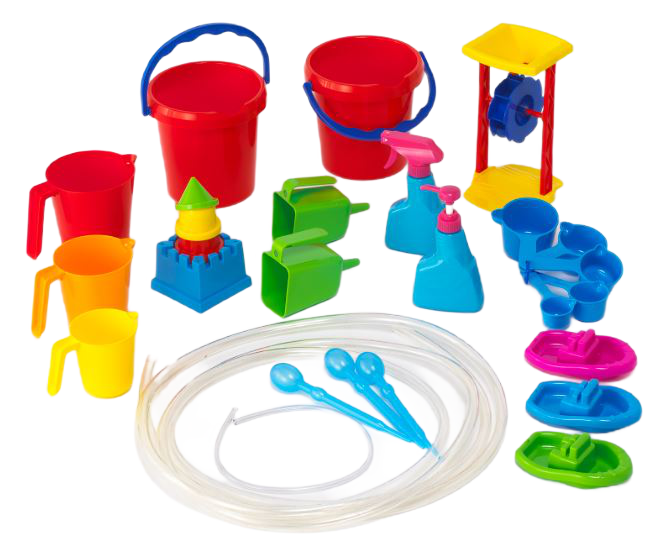 Супер большой набор для игр с водой как в группе, так и на открытом воздухе! Все, что так или иначе связано с водой: ведерки, водяное колесо, кувшины, воронки, пипетки-капельницы, шланги, пульверизатор, бутылочка с дозатором, лодочки, ковшички, формочки-башенки. В общем, все, что вы можете видеть на фото! Всего 27 деталей из прочного пластика ярких цветов. Набор упакован в картонную коробку размером: 44 х 26 х 23 см.