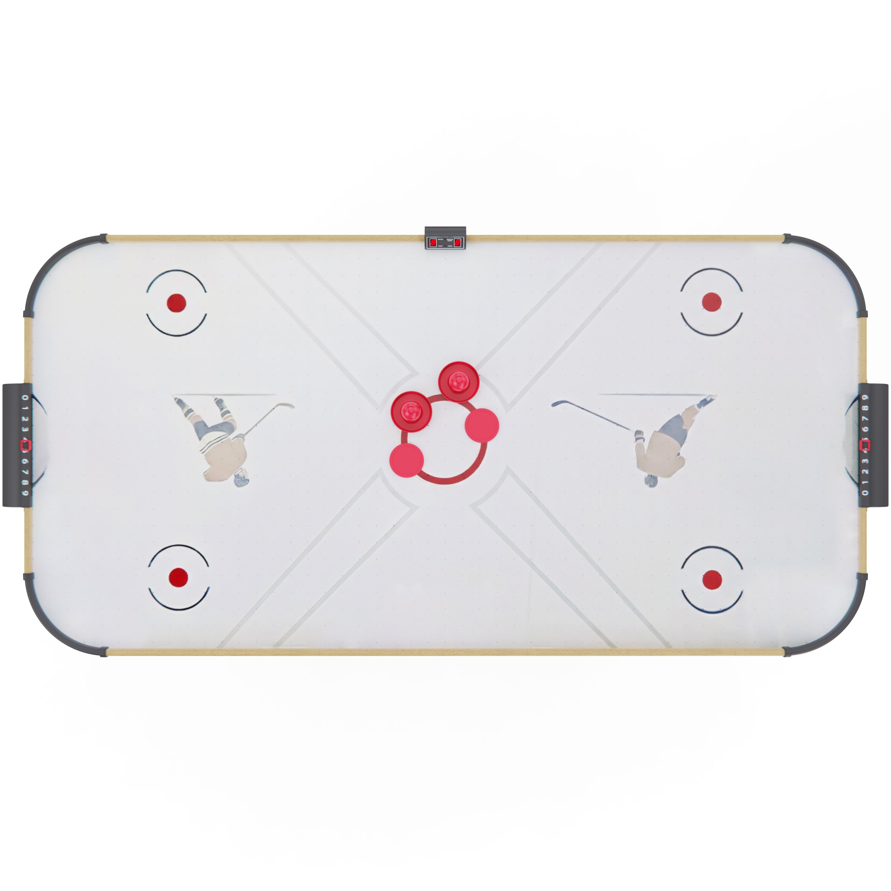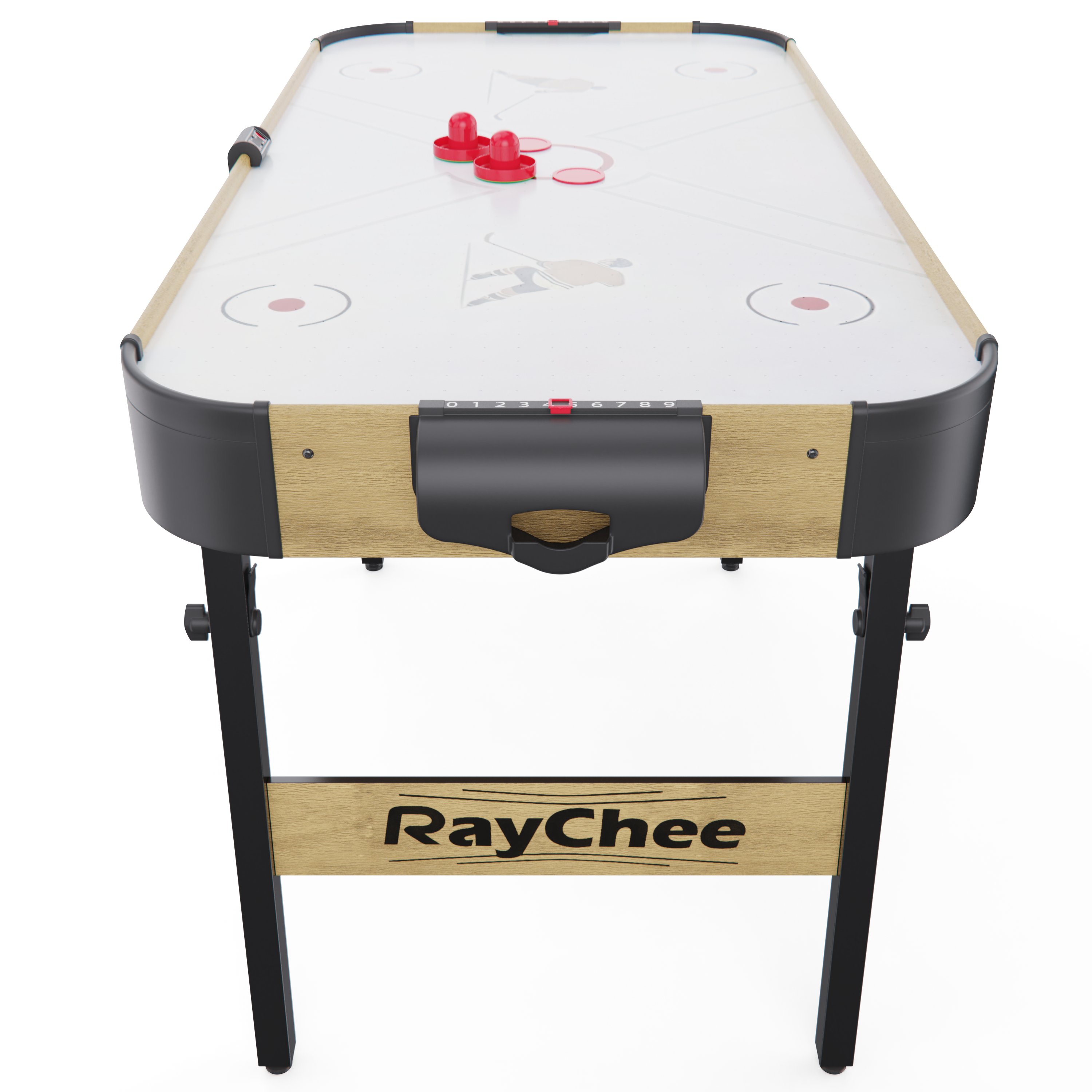 Встроенный вентилятор на 220 В создает воздушную подушку, по которой шайба скользит практически без трения — именно так достигается эффект настоящего аэрохоккея. Для удобства игроков стол оснащён электронным и механическим счётчиком очков, что позволяет отслеживать результаты в реальном времени.