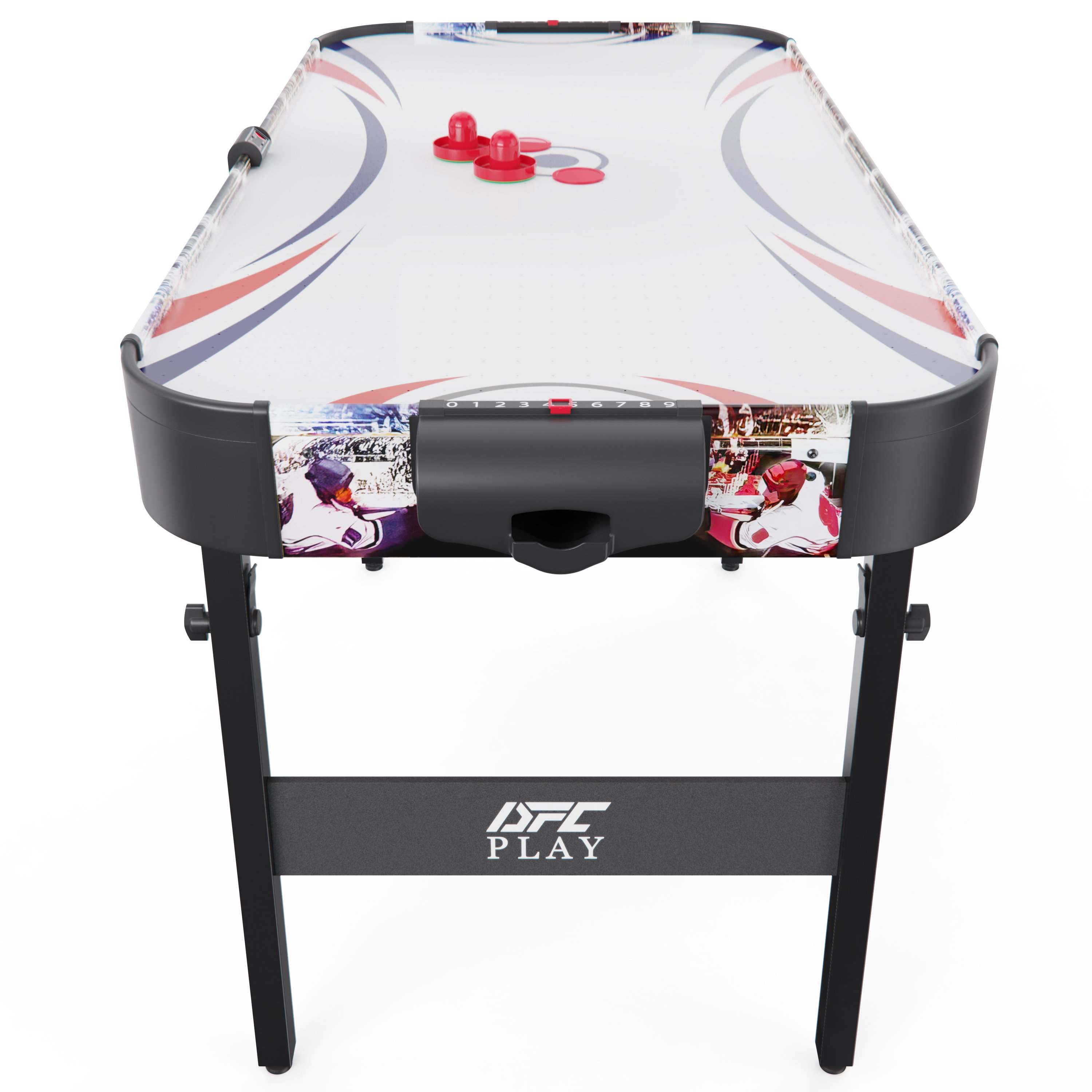 Встроенный вентилятор на 220 В создает воздушную подушку, по которой шайба скользит практически без трения — именно так достигается эффект настоящего аэрохоккея. Для удобства игроков стол оснащён электронным и механическим счётчиком очков, что позволяет отслеживать результаты в реальном времени.