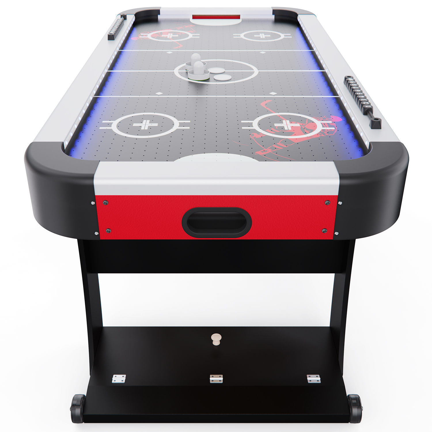 Встроенный вентилятор на 220В создает воздушную подушку, по которой шайба скользит практически без трения — именно так достигается эффект настоящего аэрохоккея. Электронный счетчик ведет учет забитых шайб, избавляя игроков от споров и добавляя соревнованию профессиональный дух. Размер стола — 135,5 х 67,6 х 81 см — позволяет разместить его даже в небольшой квартире, а прочные опорные ножки обеспечивают устойчивость во время динамичной игры.