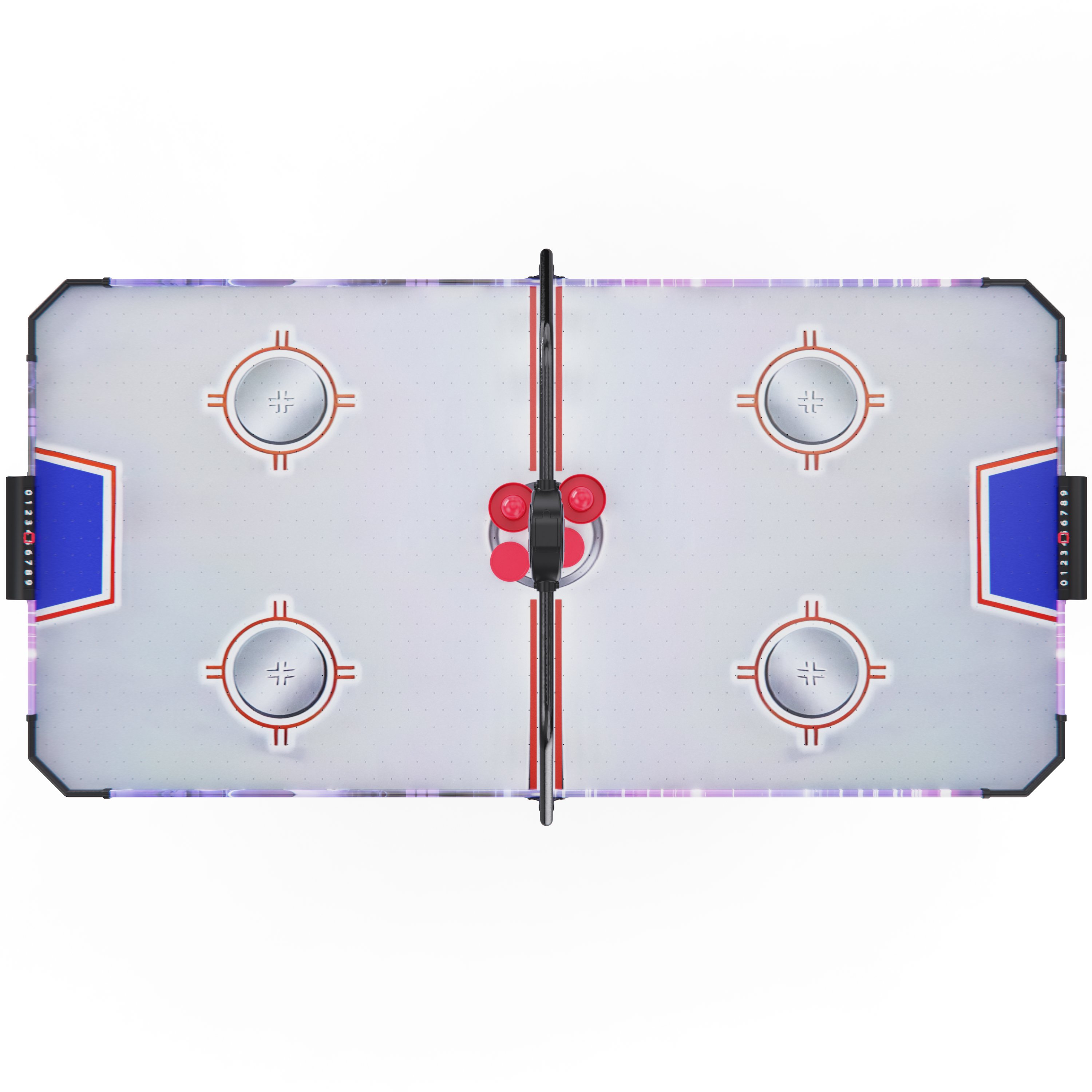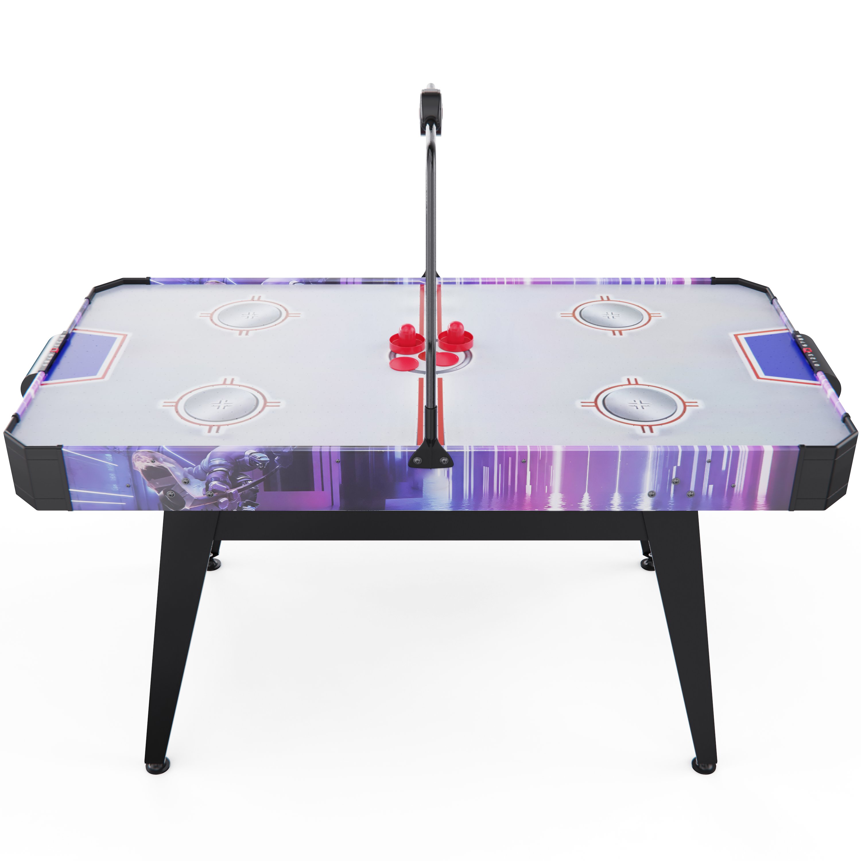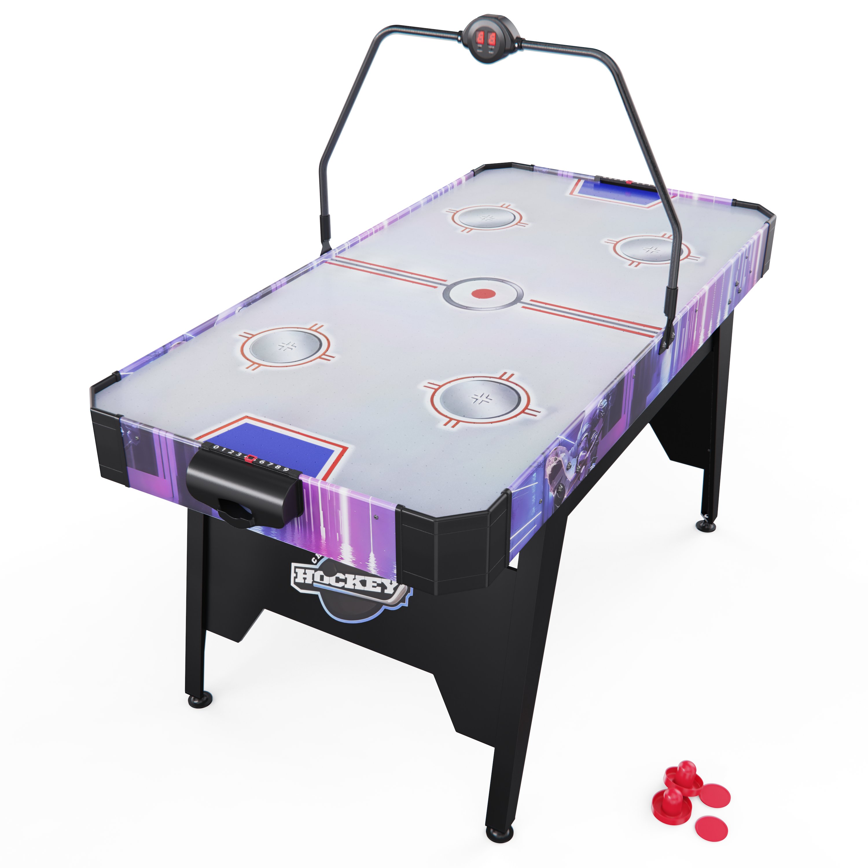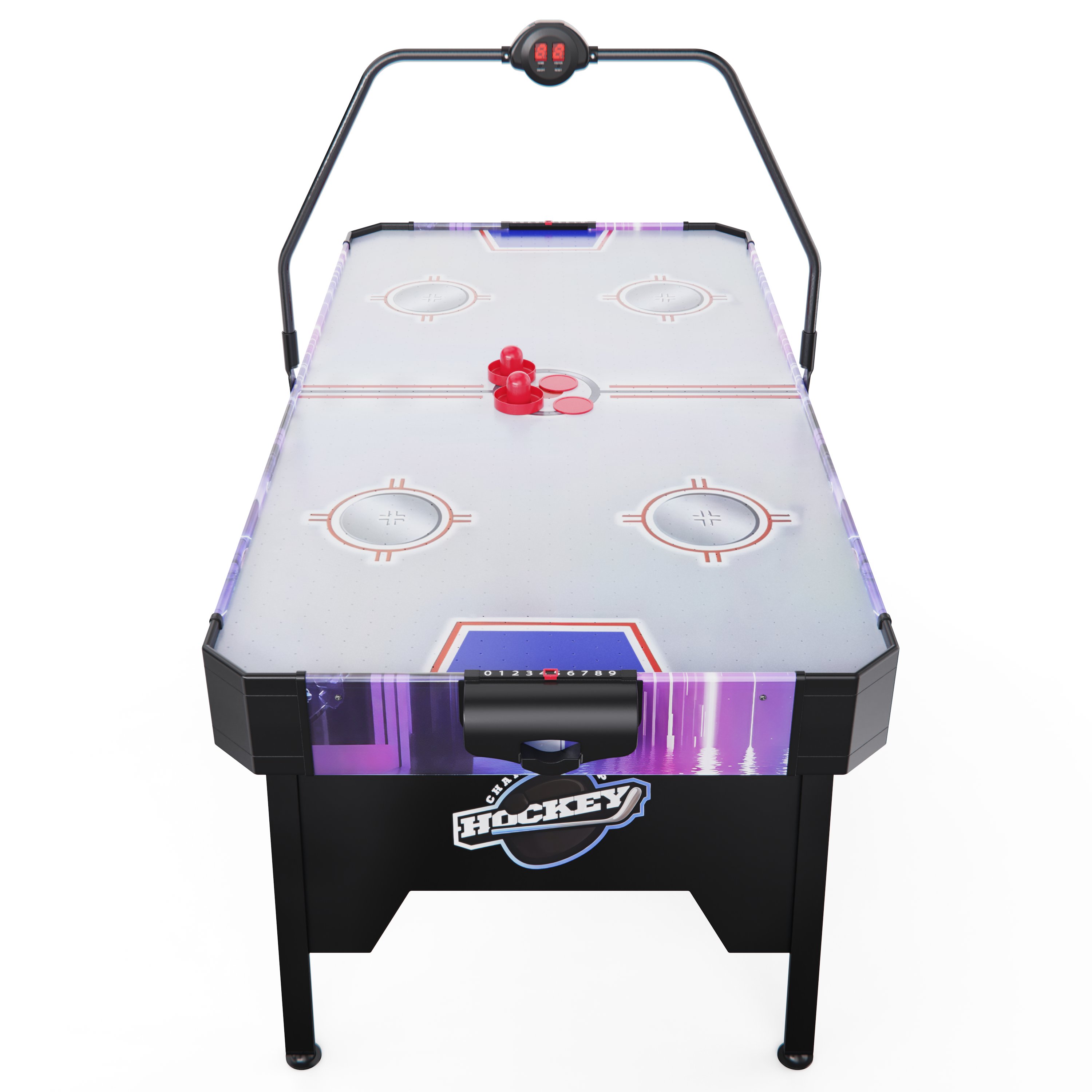 Встроенный вентилятор на 220 В создает воздушную подушку, по которой шайба скользит практически без трения — именно так достигается эффект настоящего аэрохоккея. Для удобства игроков стол оснащён электронным и механическим счётчиком очков, что позволяет отслеживать результаты в реальном времени.
