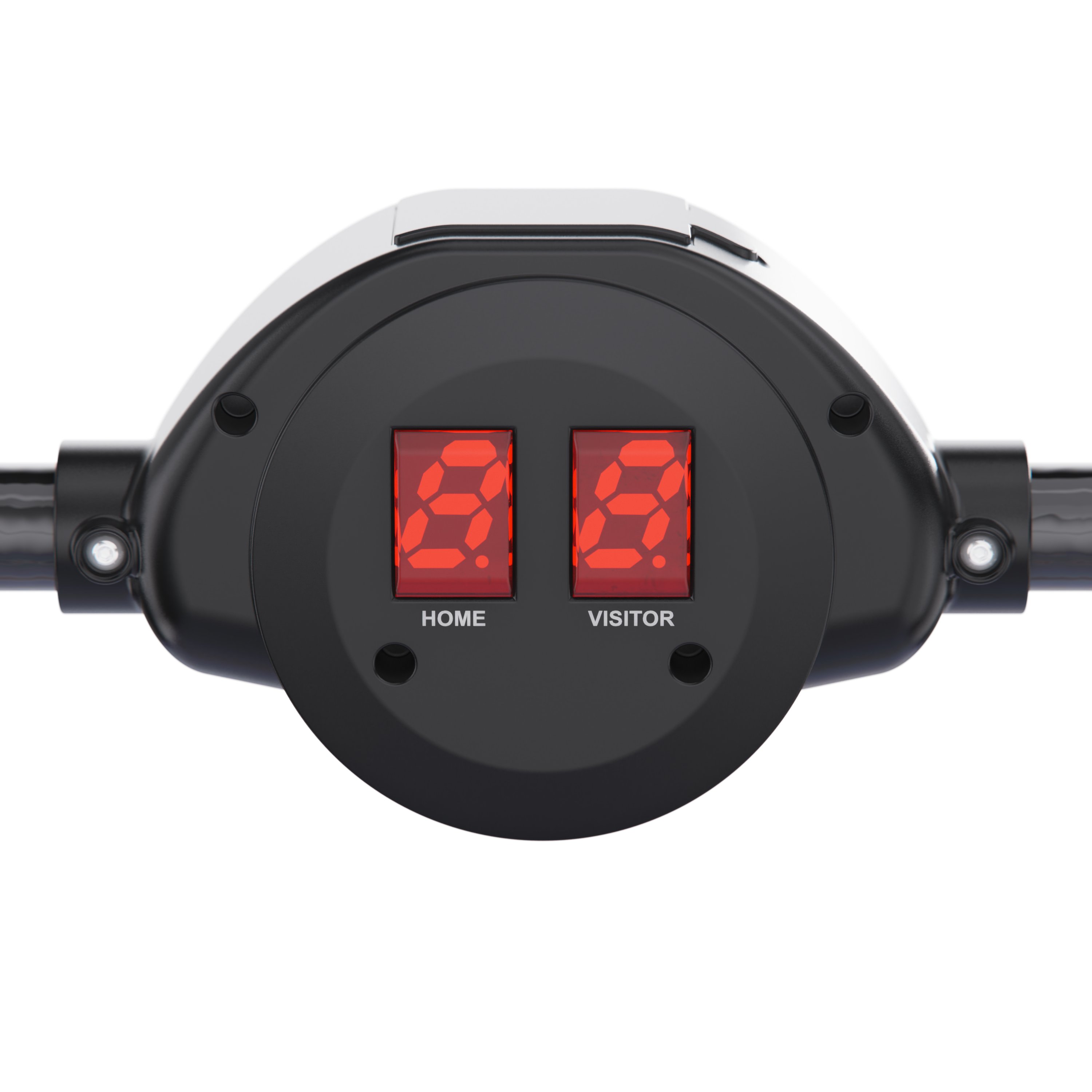 Электронное табло работает от двух батареек типа AA (в комплект не входят). В набор также входят 2 биты диаметром 65 мм и 2 шайбы диаметром 55 мм — все, что нужно для увлекательной игры сразу после сборки.