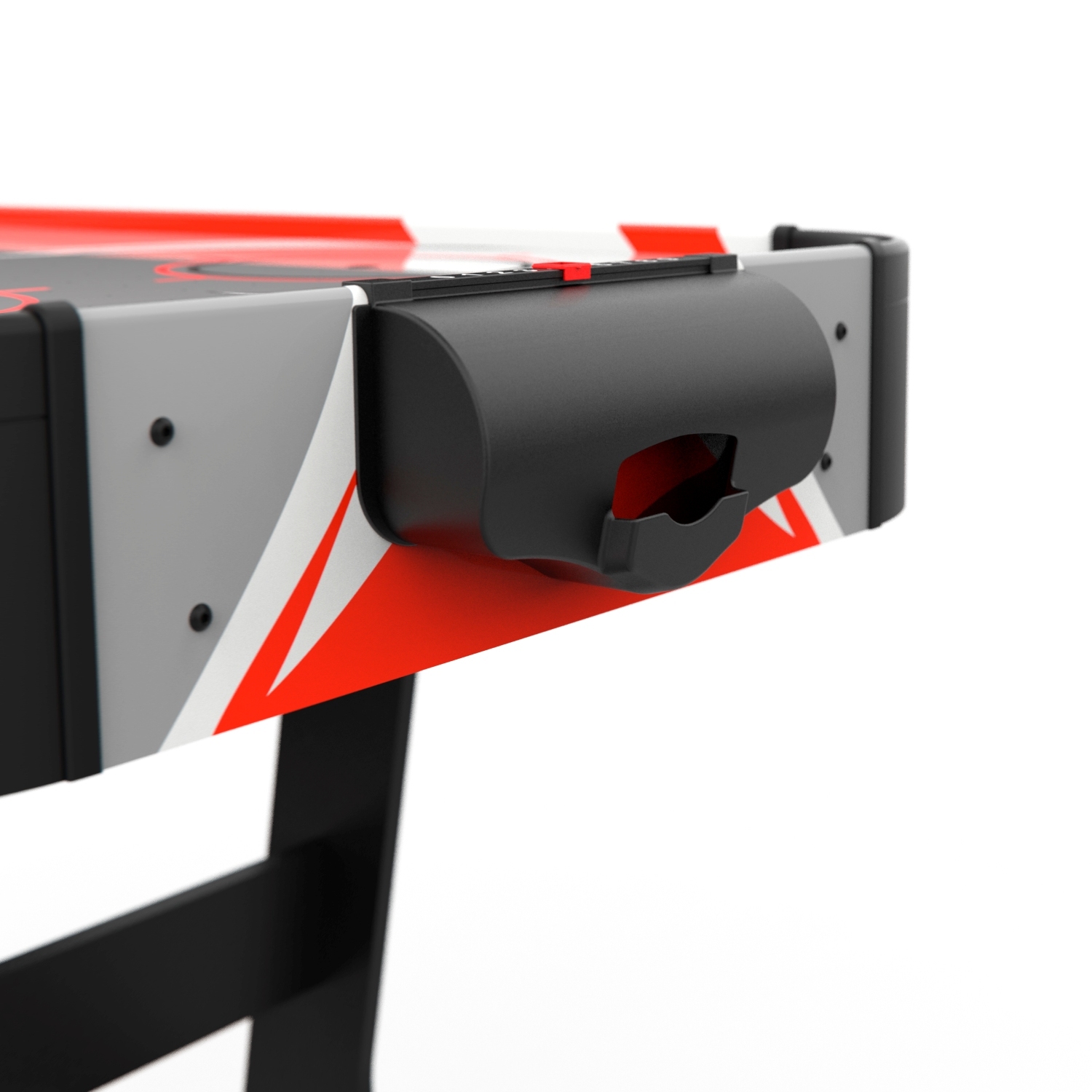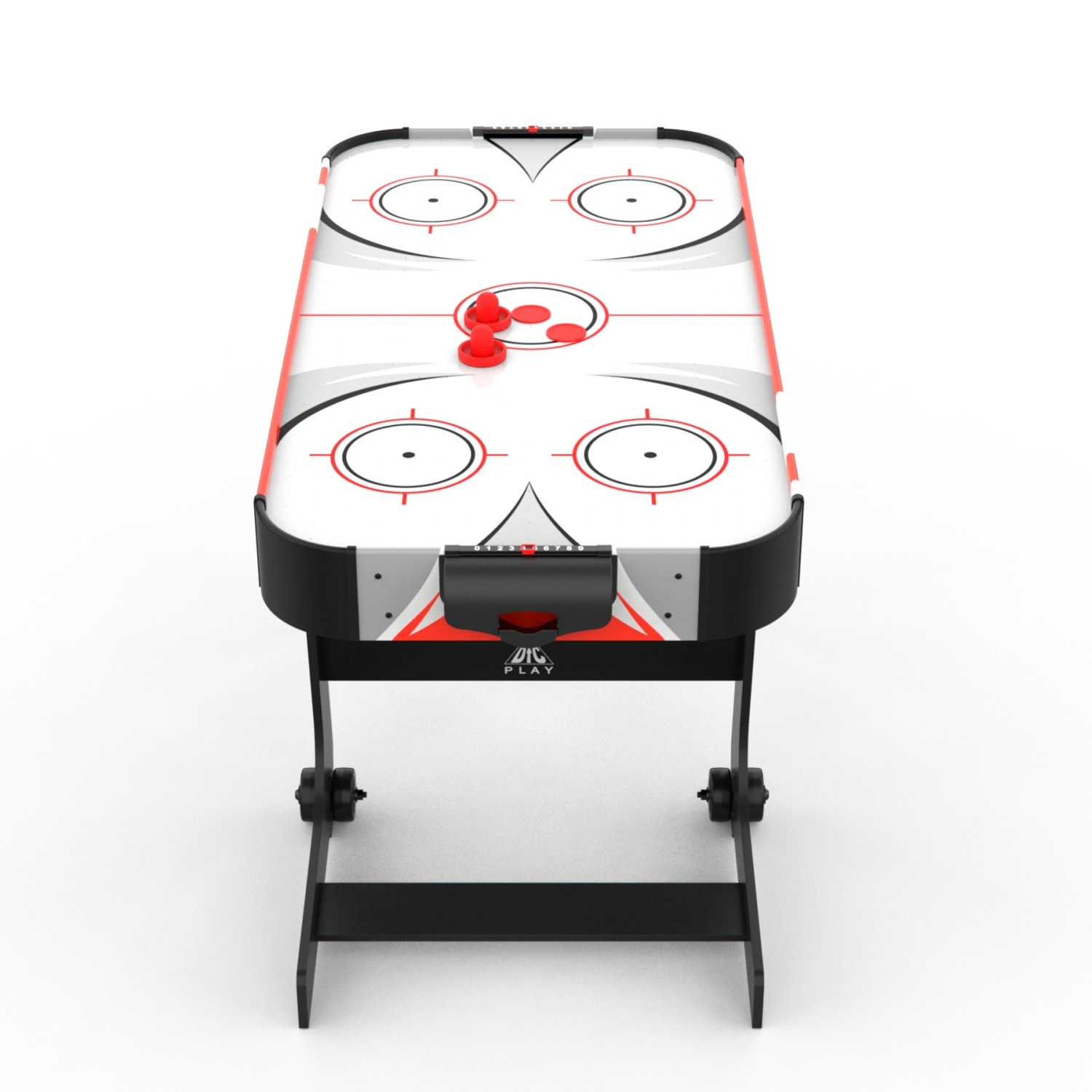 В комплект поставки входят 2 биты и 2 шайбы, а также механические счётчики голов. Аэрохоккей оснащён одним вентилятором и работает от сети с напряжением 220 вольт. Аэрохоккей легко сложить и откатить в угол комнаты или за диван после игры.