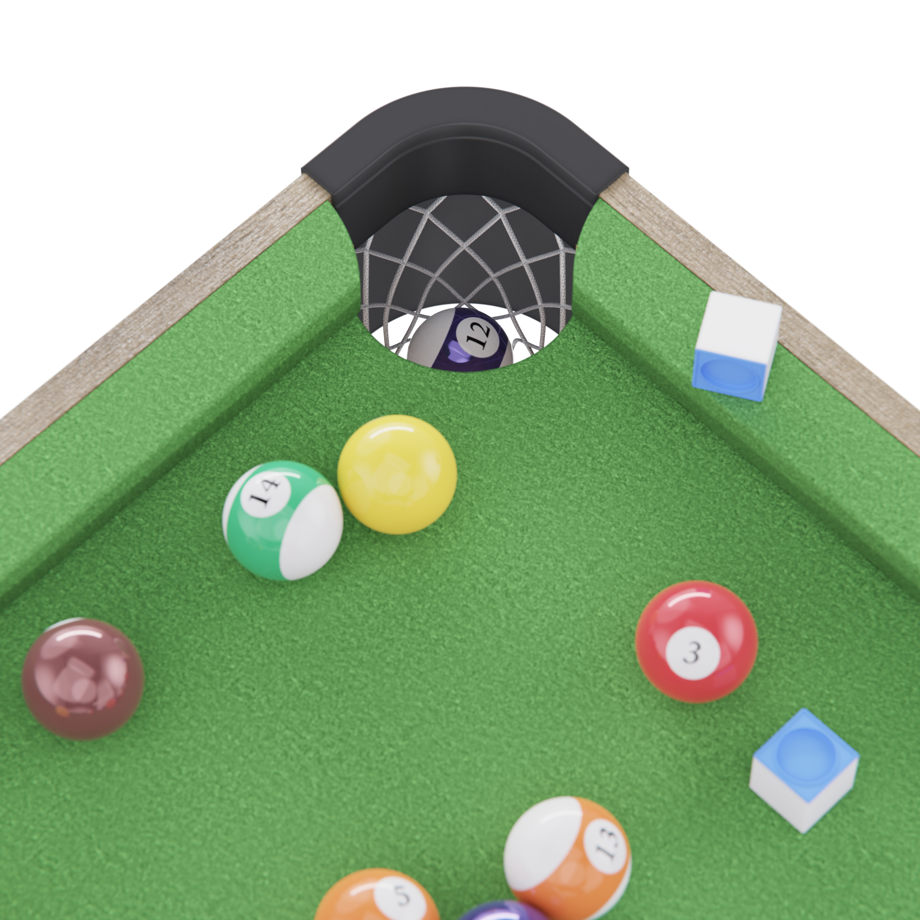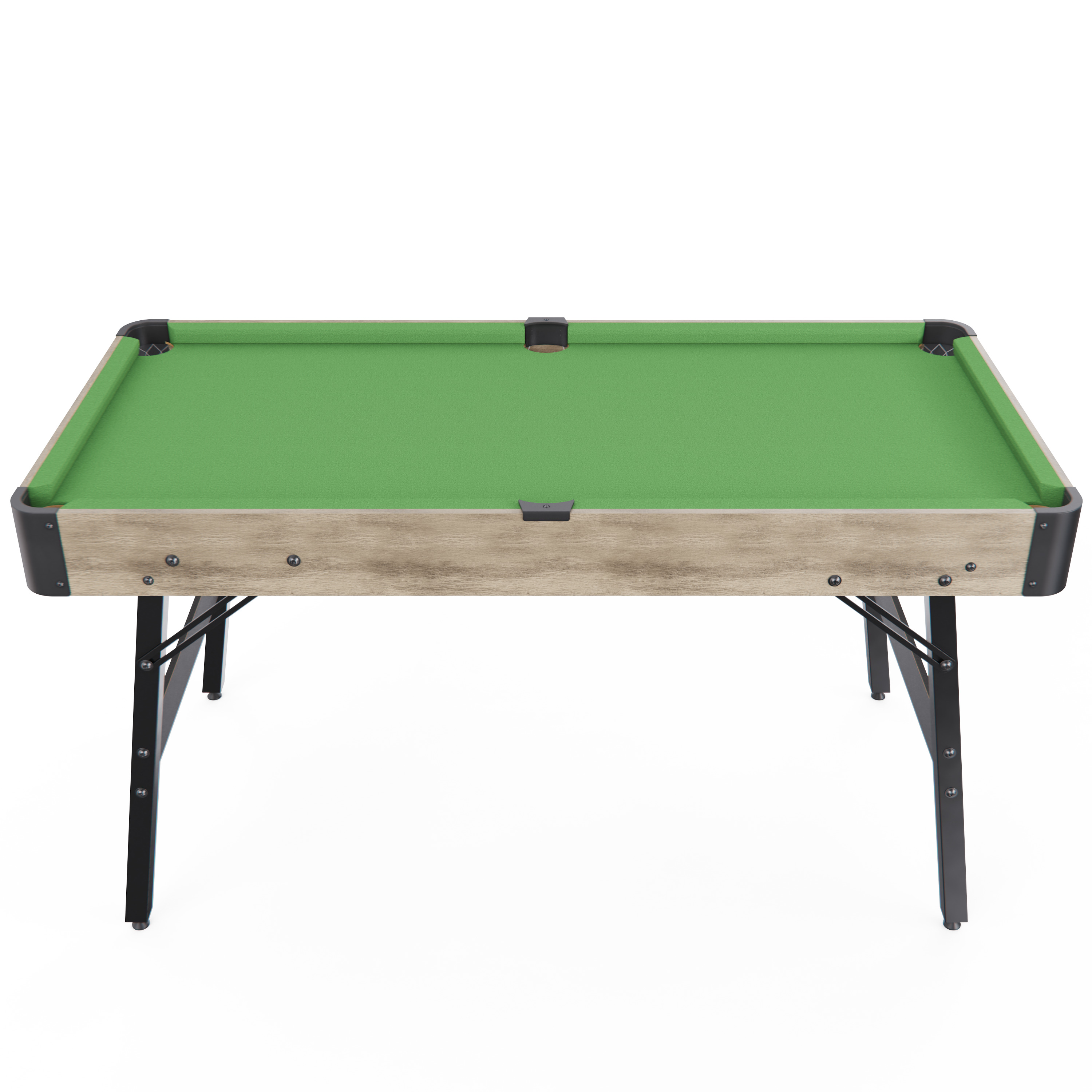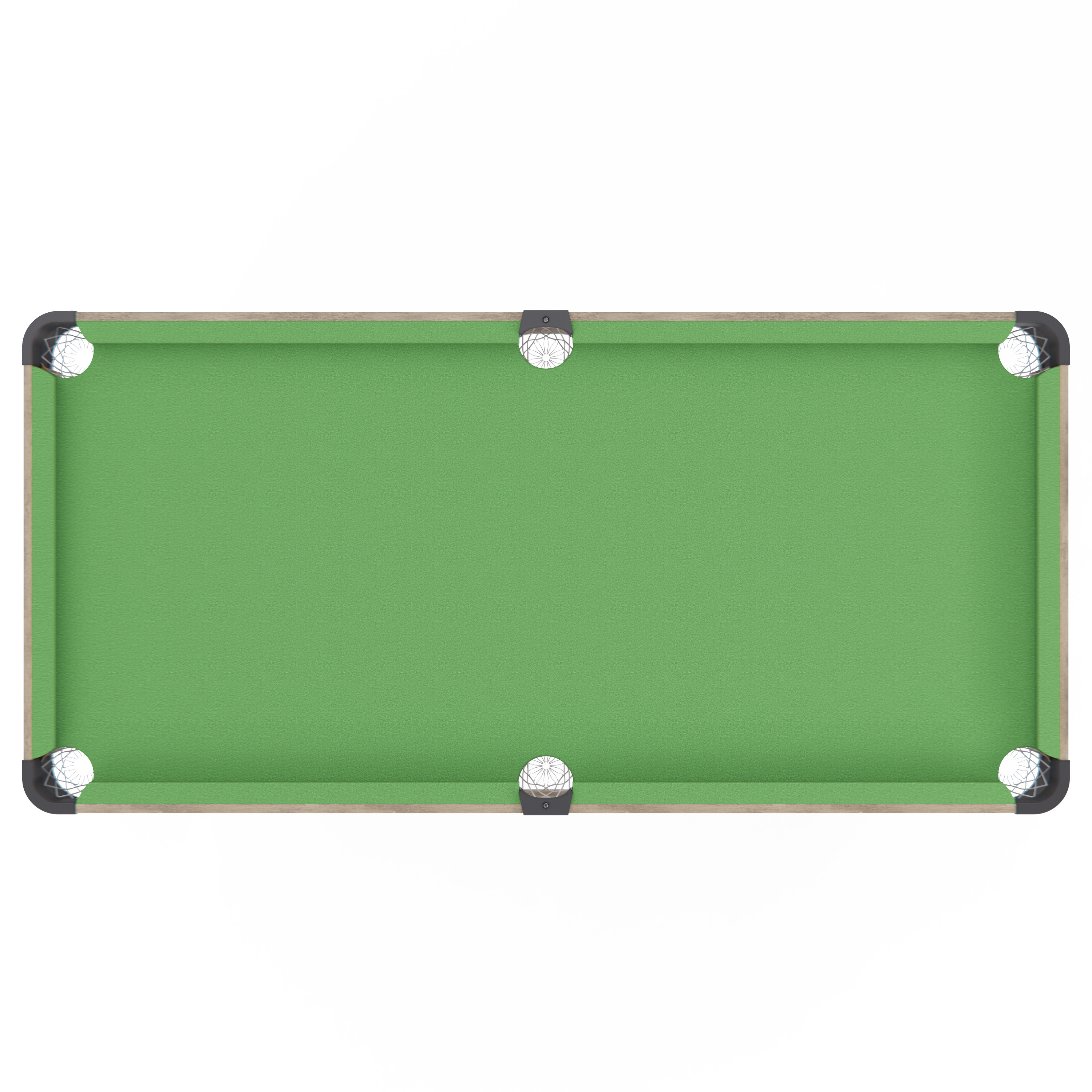 Размер игрового поля составляет 114 х 53 см, что обеспечивает комфортное размещение шаров и свободное перемещение кия. Игровая поверхность выполнена из МДФ с покрытием ПВХ и бархатным сукном, что гарантирует долговечность, ровный ход шаров и приятное ощущение при игре. Толщина игрового поля — 9 мм, высота бортиков от поля — 25 мм, а их толщина — 12 мм, что обеспечивает стабильное отражение шаров при столкновениях.