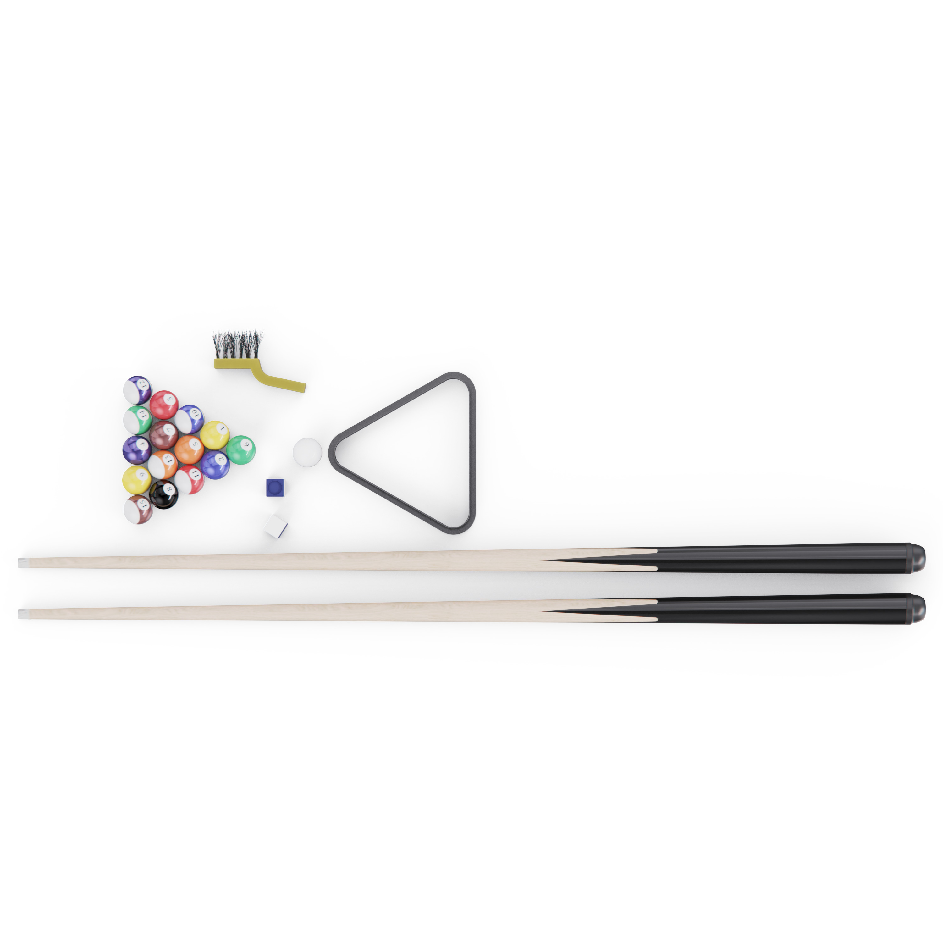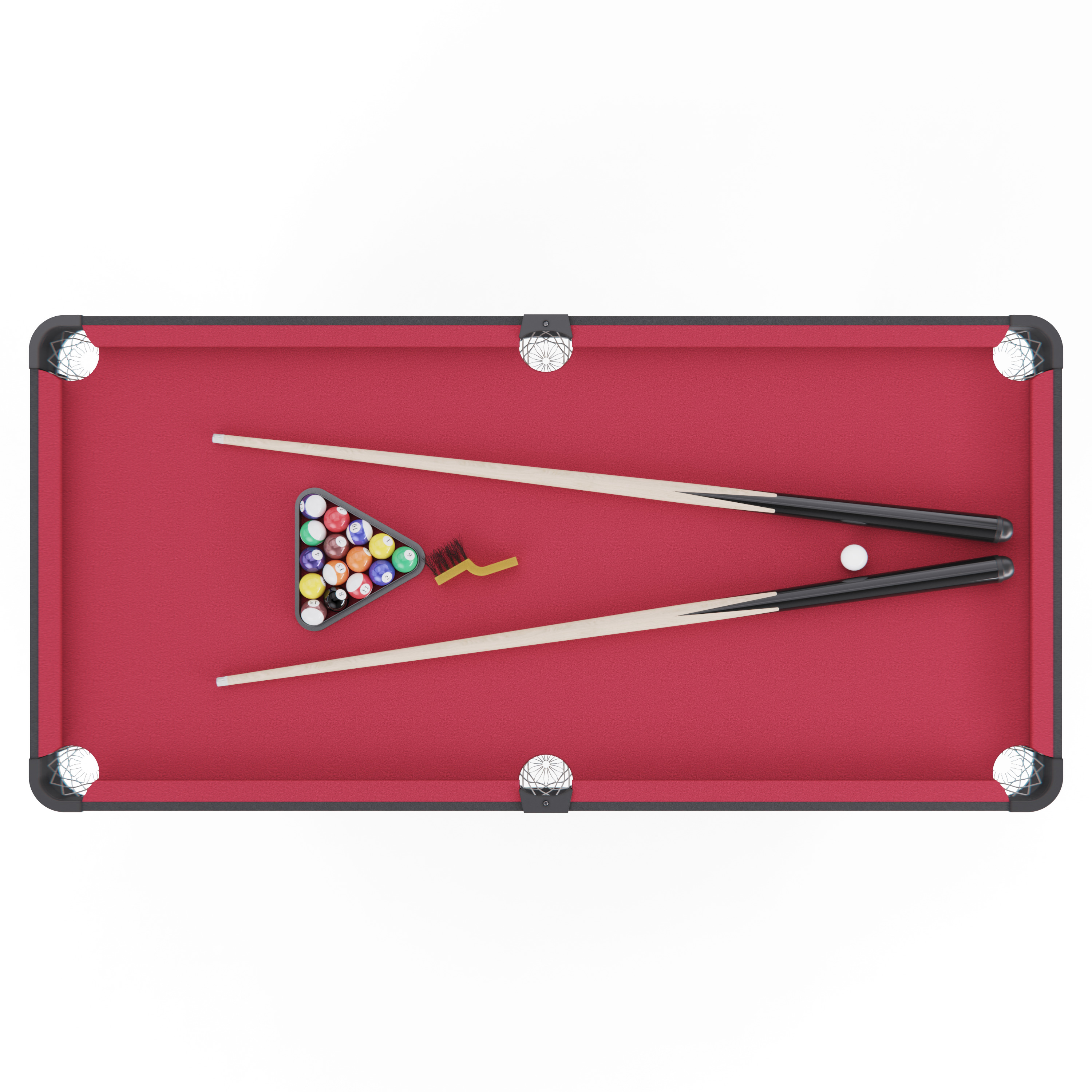 В комплект входят все необходимые аксессуары для игры: шарики, мел, кий, треугольник для выравнивания шаров и щётка для ухода за игровым полем. Длина кия 106,7 см делает игру удобной для игроков любого роста, а компенсаторы неровностей пола позволяют выставить стол идеально ровно, обеспечивая стабильность и безопасность во время игры. Высота ножек — 67 см, что создаёт комфортное положение для игры стоя.