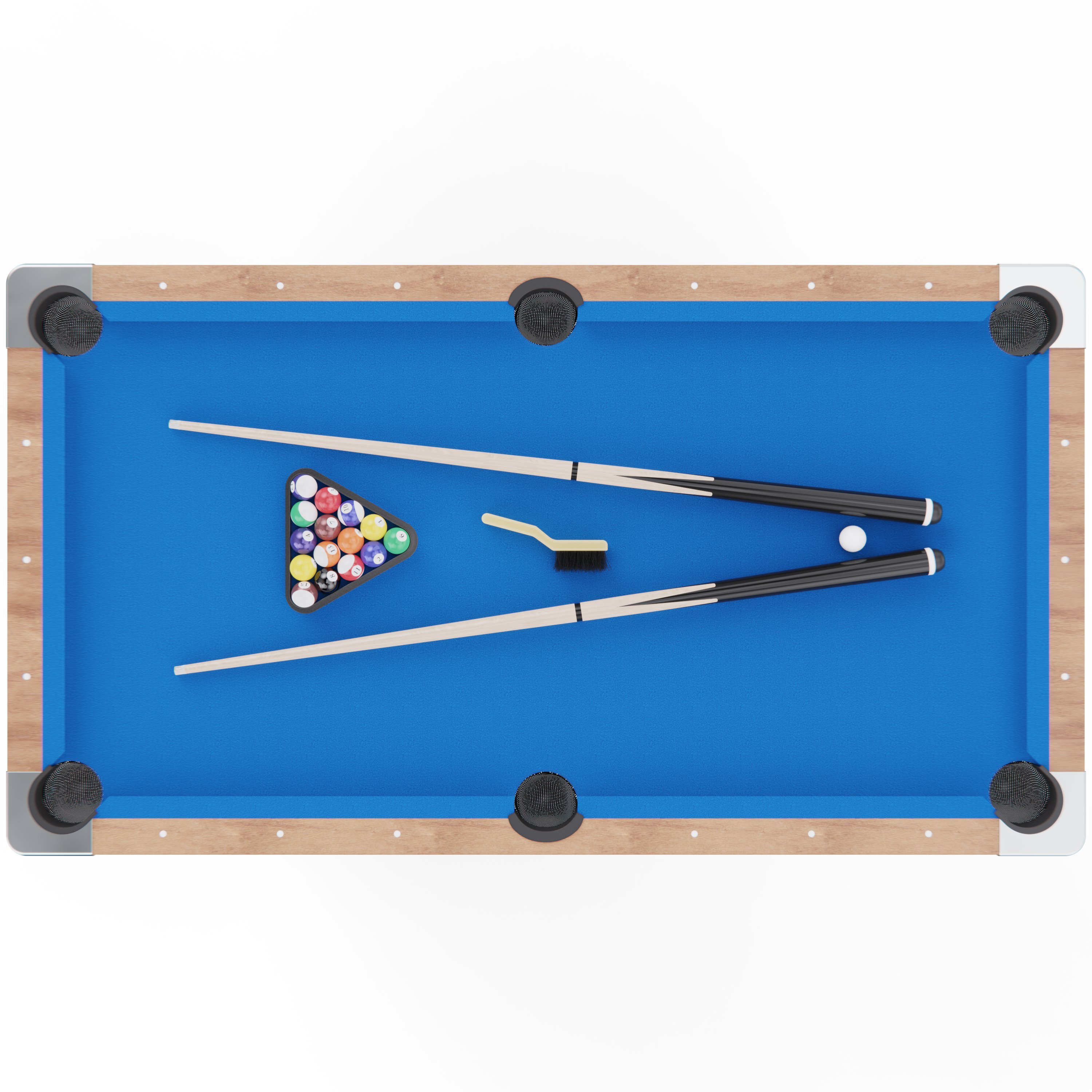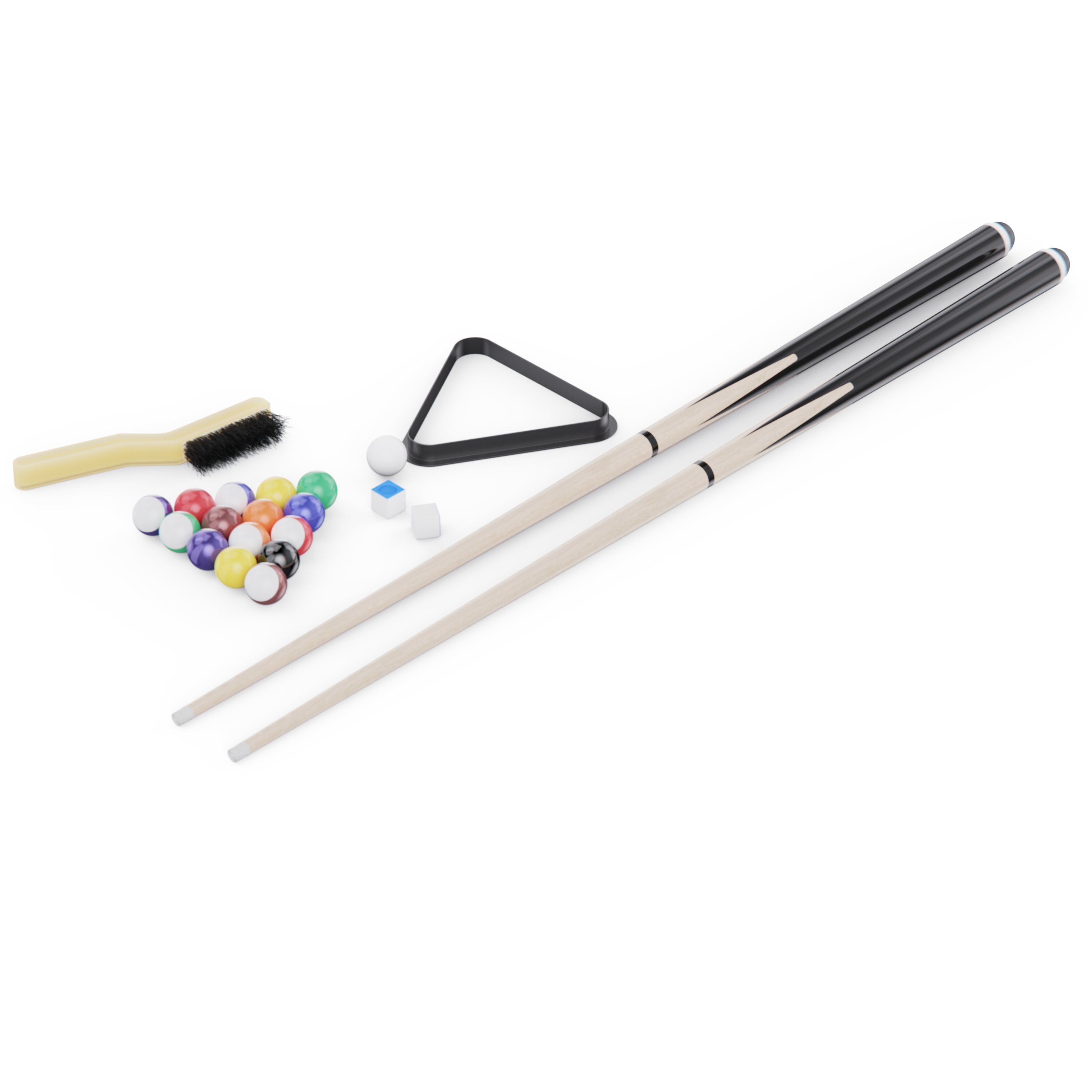 В комплект входят все необходимые аксессуары для игры: шарики, мел, кий, треугольник для выравнивания шаров и щётка для ухода за игровым полем. Длина кия 145 см делает игру удобной для игроков любого роста, а точная регулировка ножек и компенсаторы неровностей пола позволяют выставить стол идеально ровно, обеспечивая стабильность и безопасность во время игры. Высота ножек — 66 см, что создаёт комфортное положение для игры стоя.
