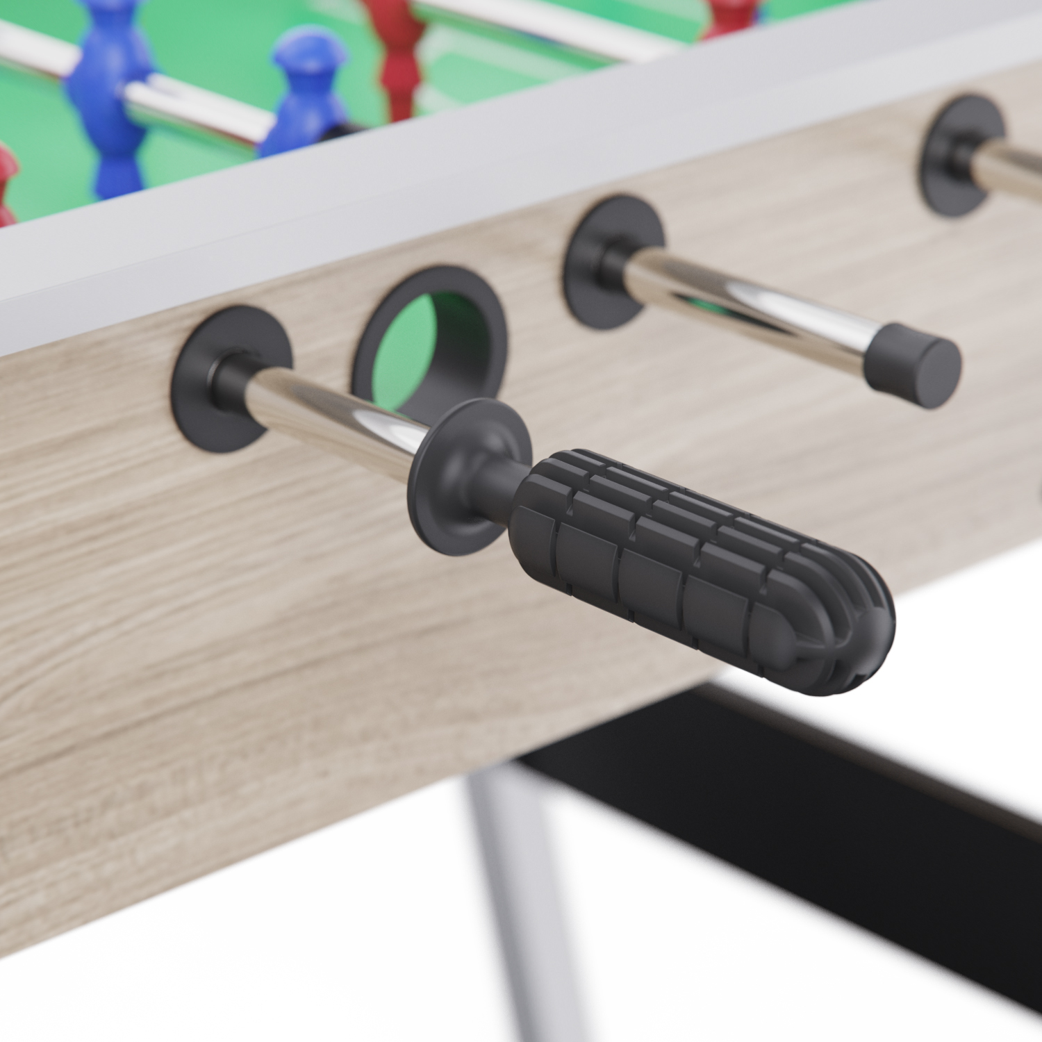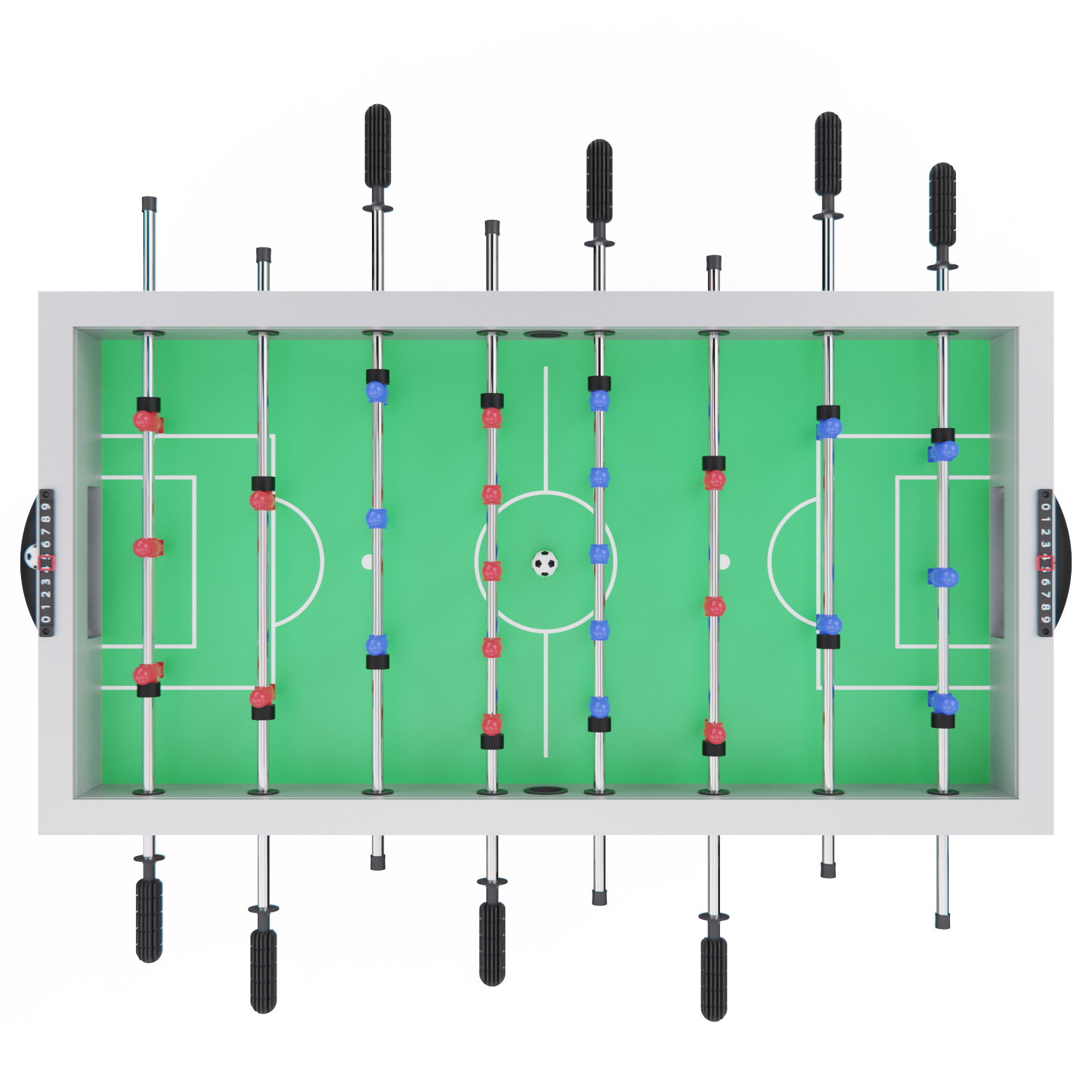 Игровая зона настольного футбола продумана до мелочей: бортики толщиной 12 мм, высотой 10,4 см обеспечивают комфортное ведение мяча, а толщина самого игрового поля — 3 мм — способствует плавному скольжению. В комплект входят 2 мяча диаметром 32 мм, что позволяет сразу начать игру. Фигурки игроков имеют высоту 96 мм и установлены на прочных металлических направляющих с удобными прорезиненными ручками.