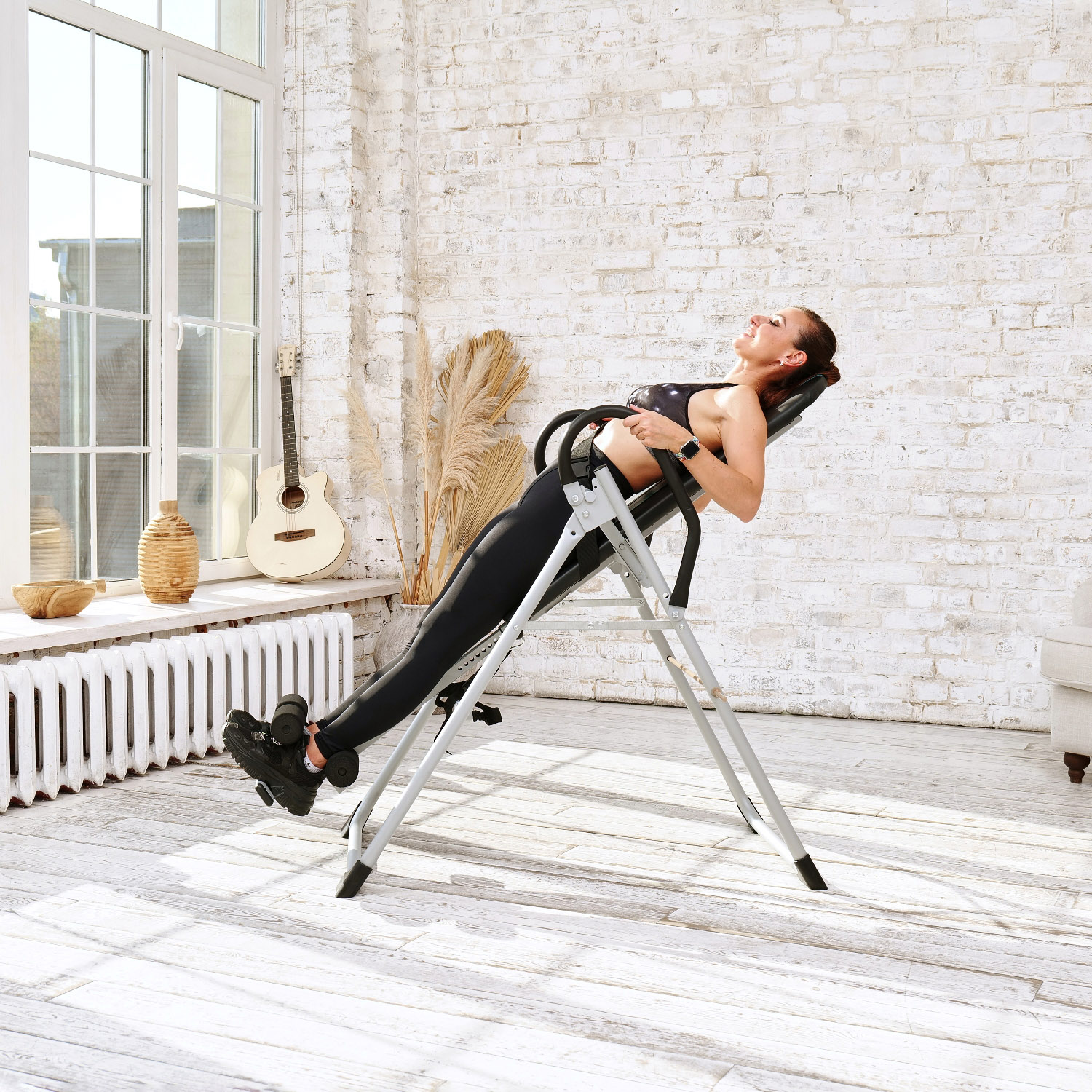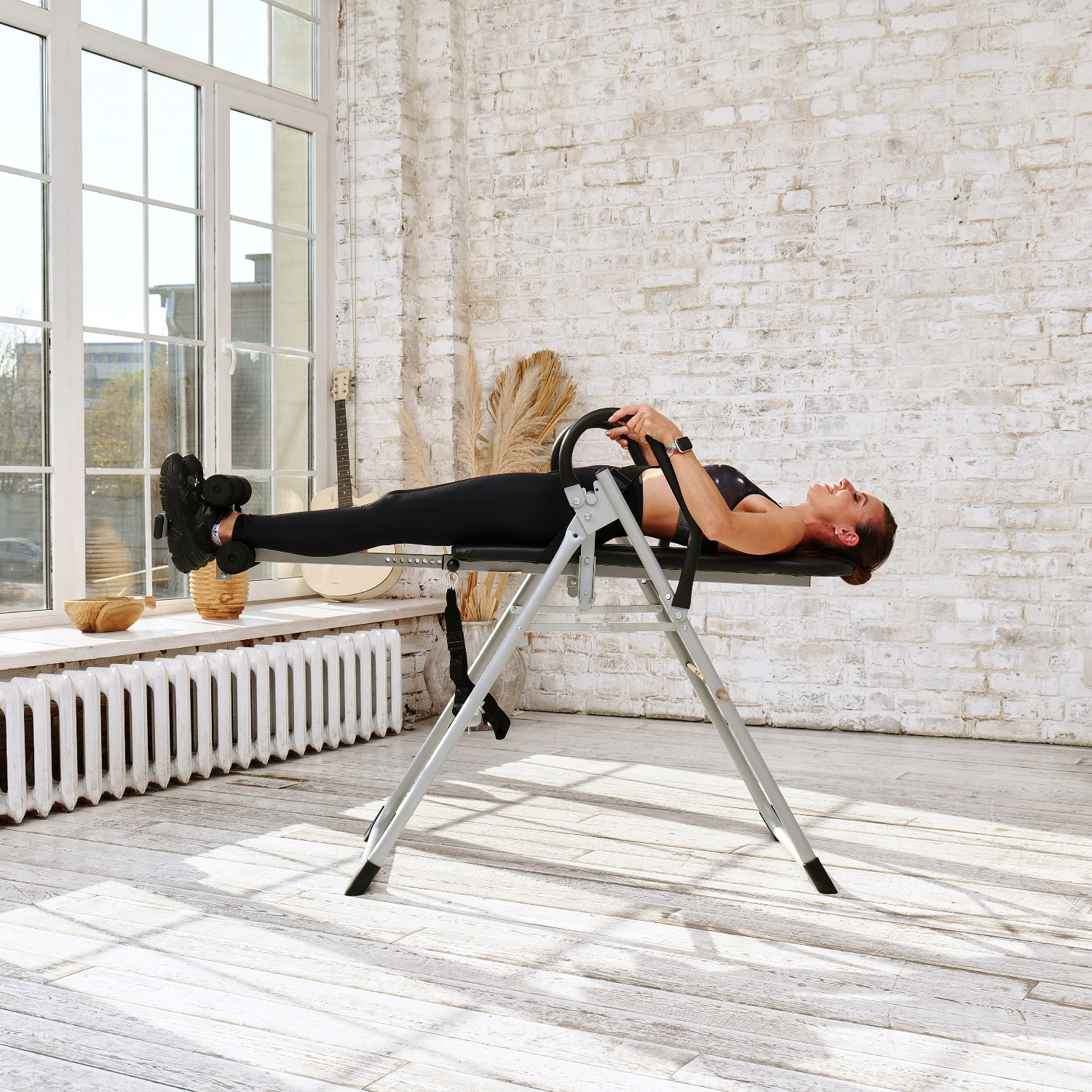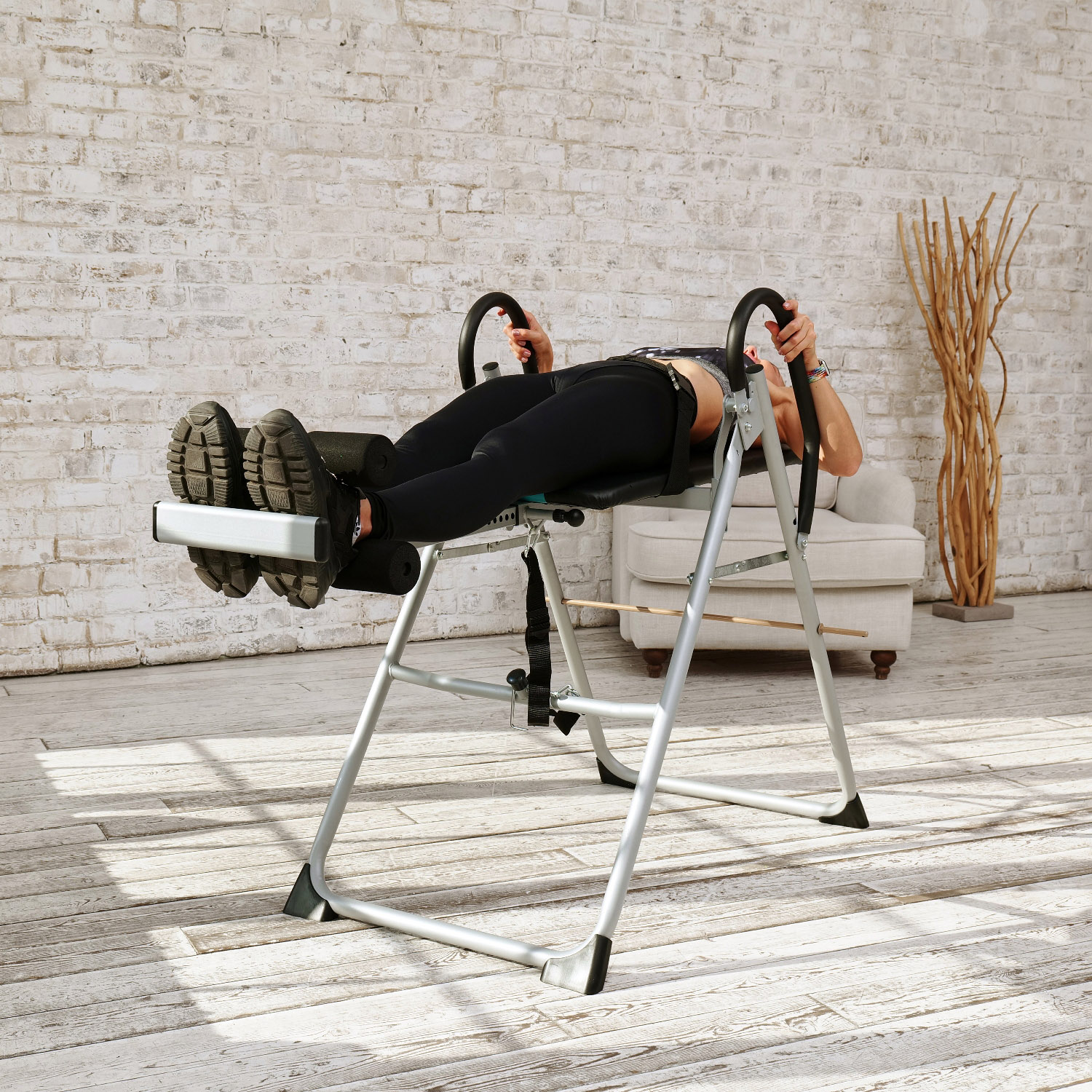 Стол позволяет зафиксировать нужный угол наклона с помощью ремня и перекладины. До начала занятия наклоните стол до нужного уровня и подтяните ремень. Если снять ограничительную перекладину, то возможно отклонится в вертикальное положение (головой в пол).