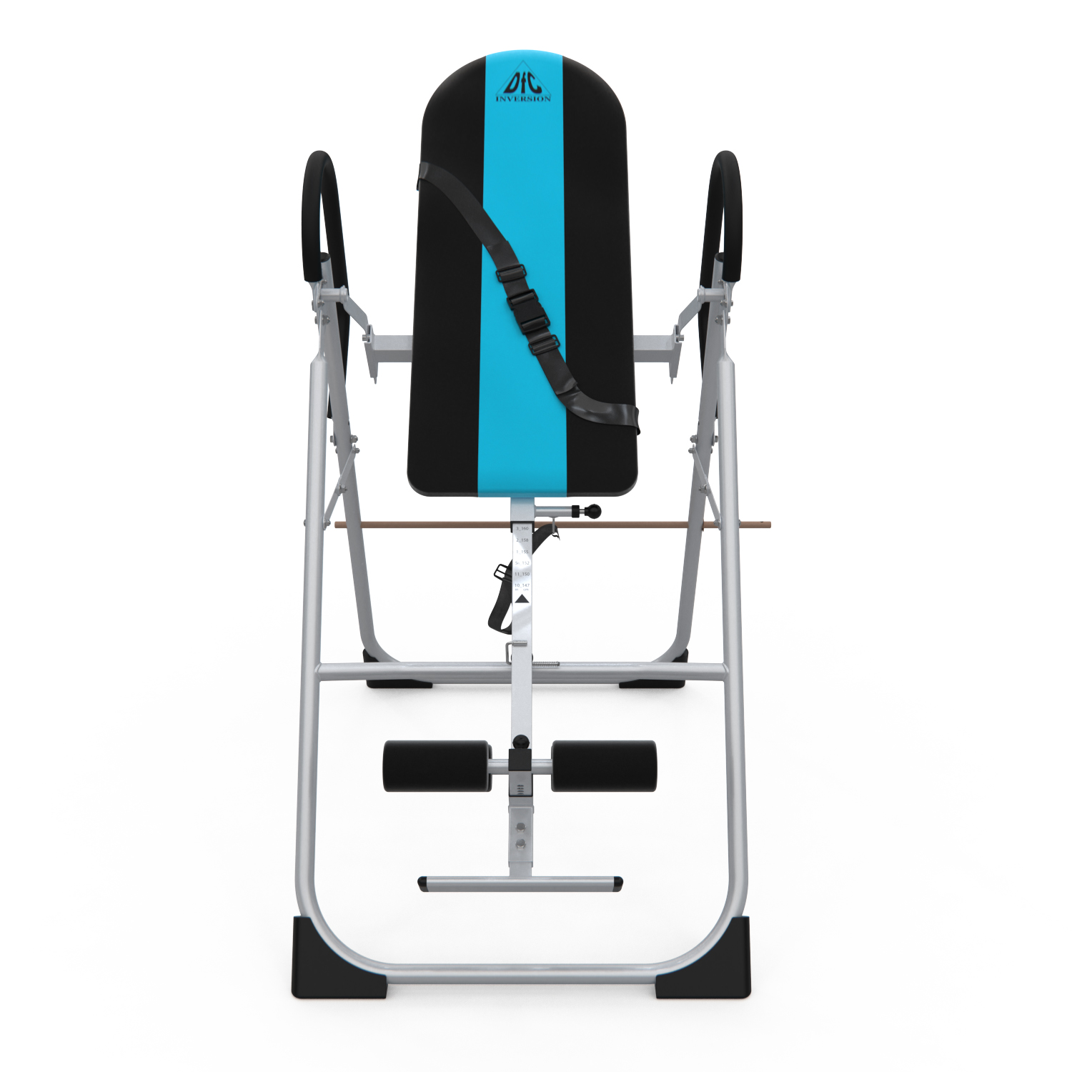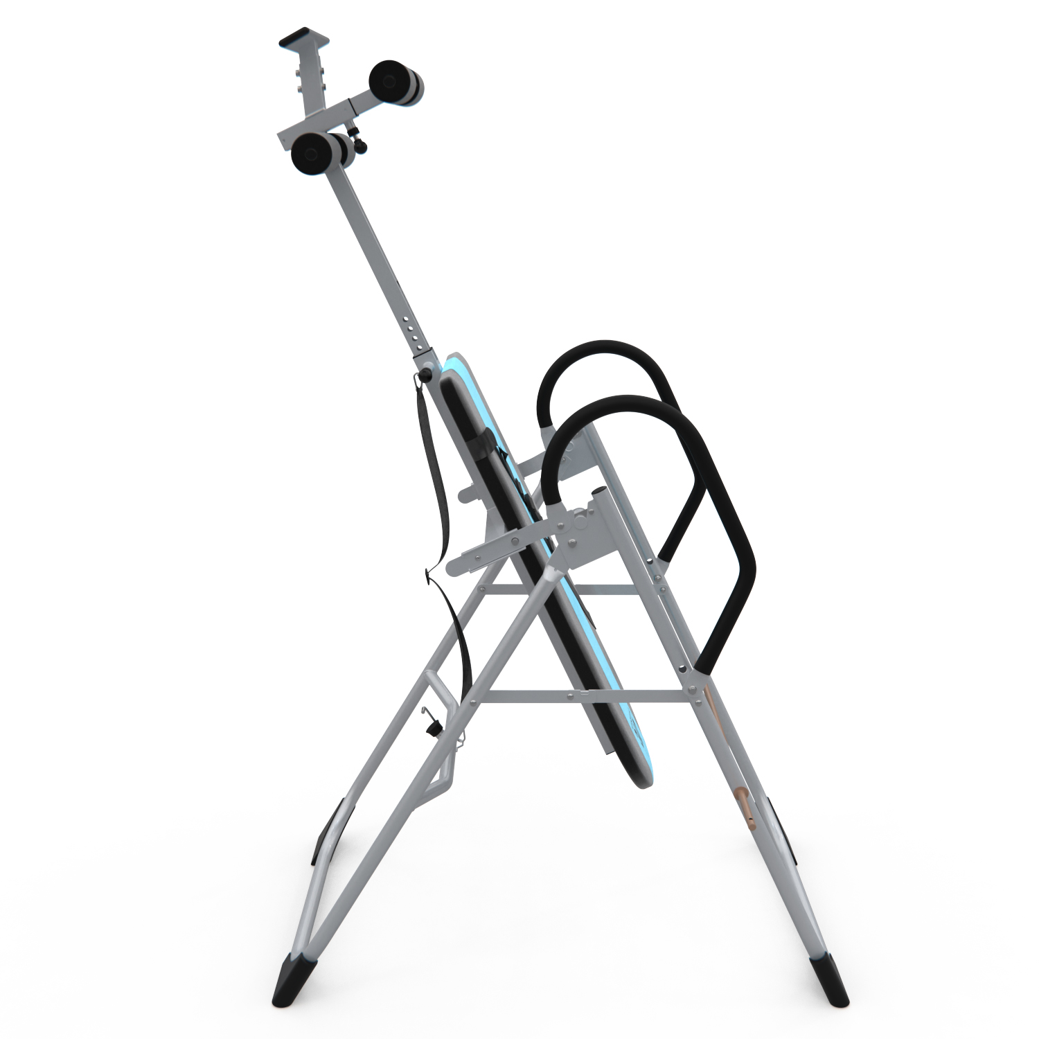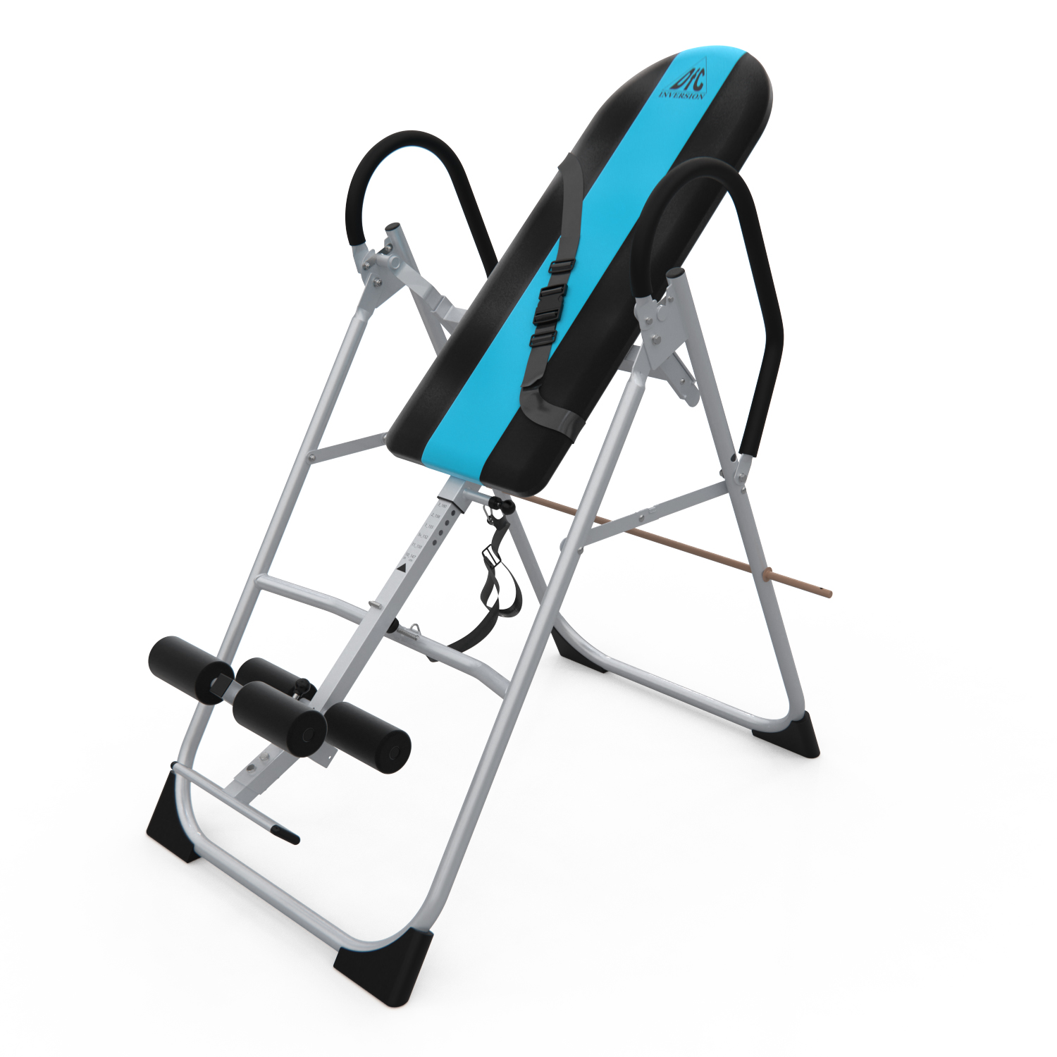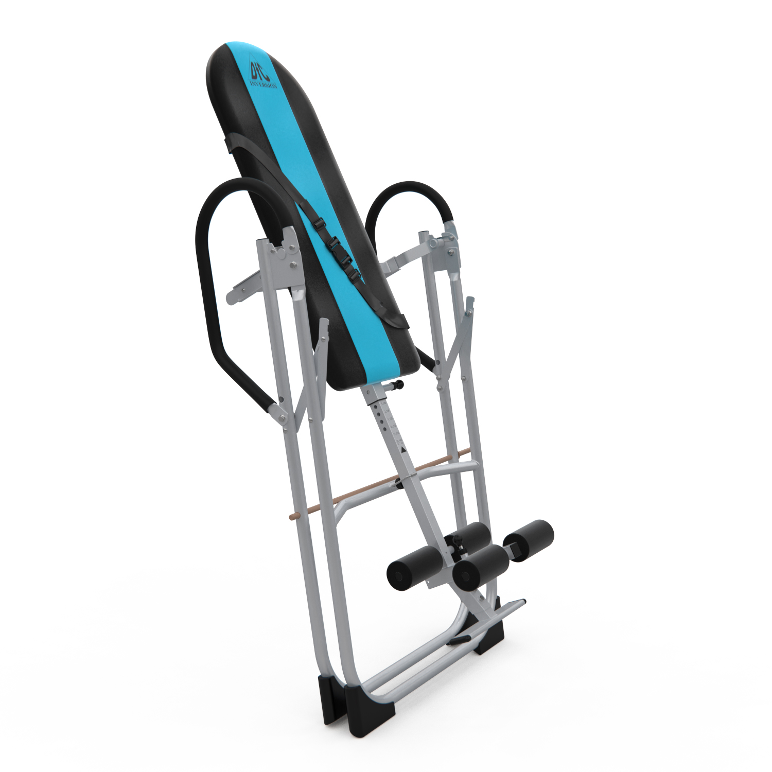 Инверсионный стол складной для домашнего использования с удобной мягкой спинкой. Цвет спинки чёрный с яркой голубой вставкой. Фиксатором для ног являются мягкие валики, регулируемые по длине.