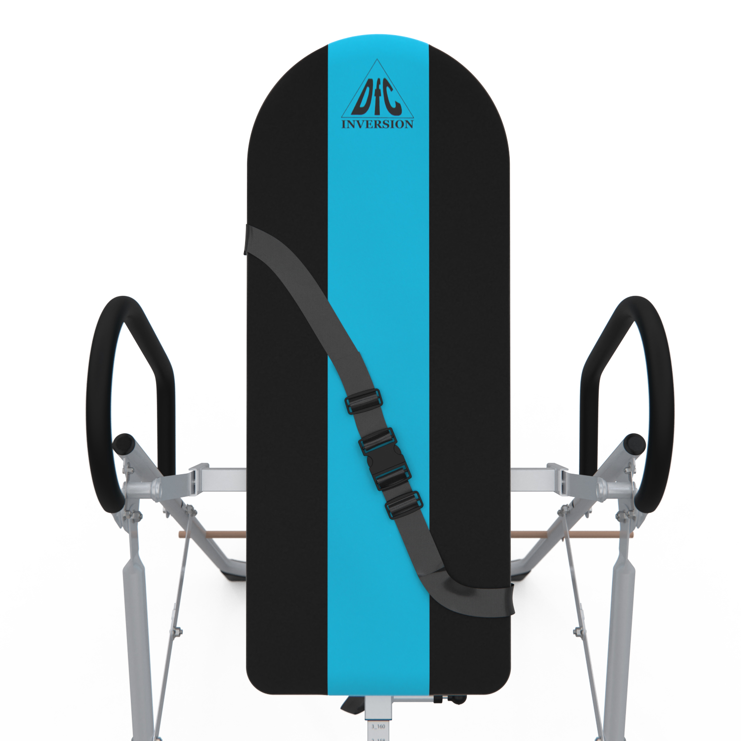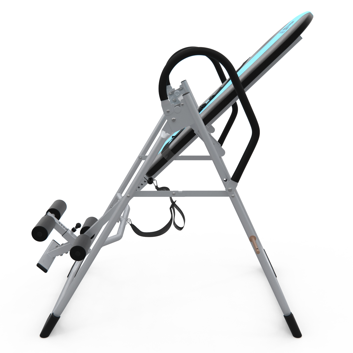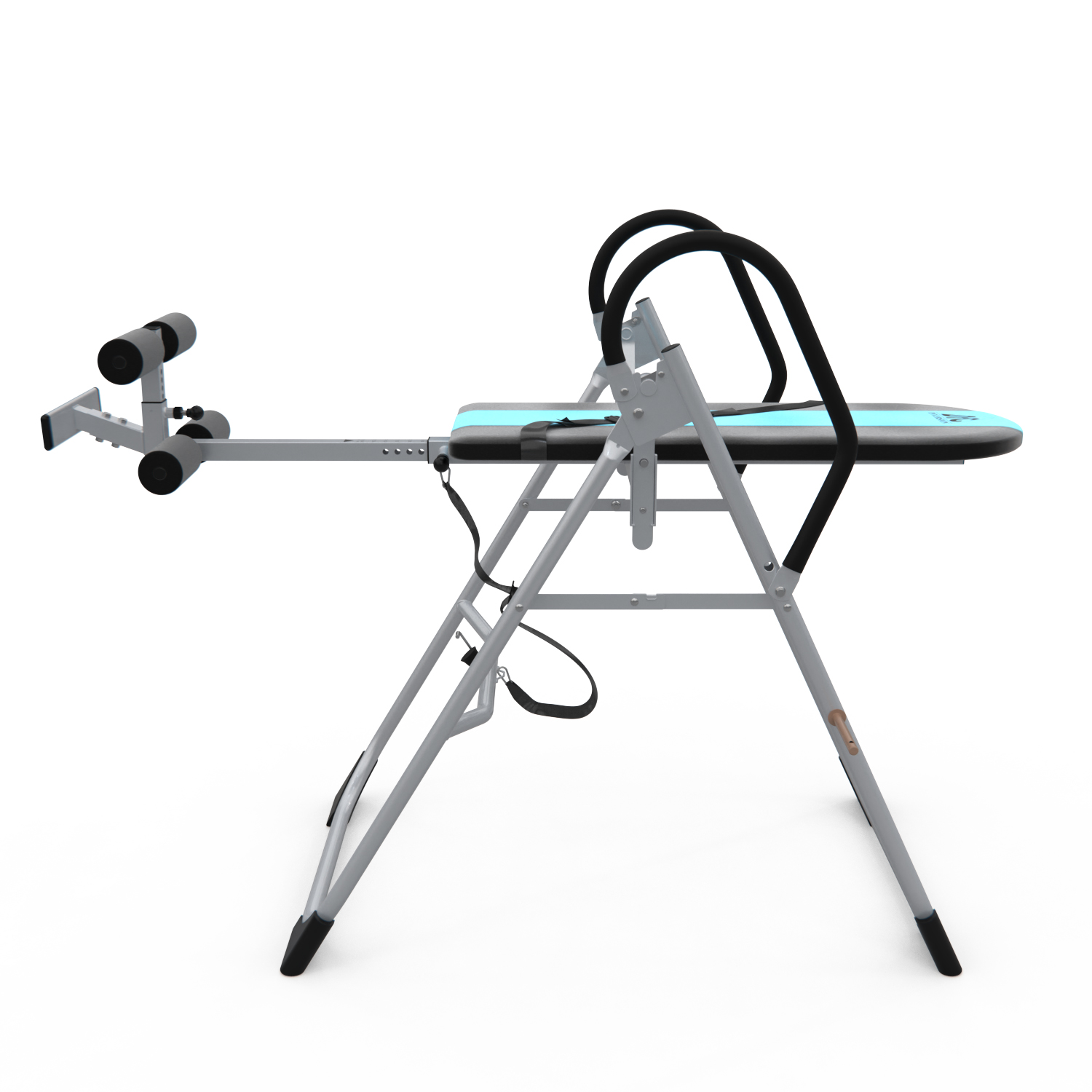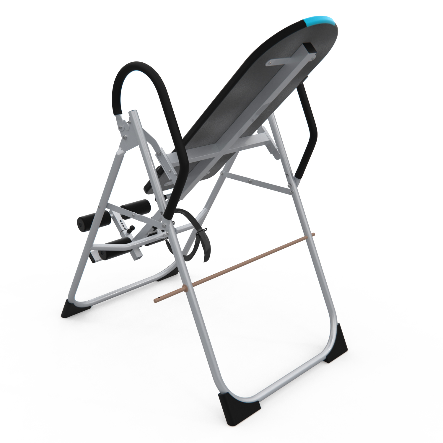 Инверсионный стол складной для домашнего использования с удобной мягкой спинкой. Цвет спинки чёрный с яркой голубой вставкой. Фиксатором для ног являются мягкие валики, регулируемые по длине.