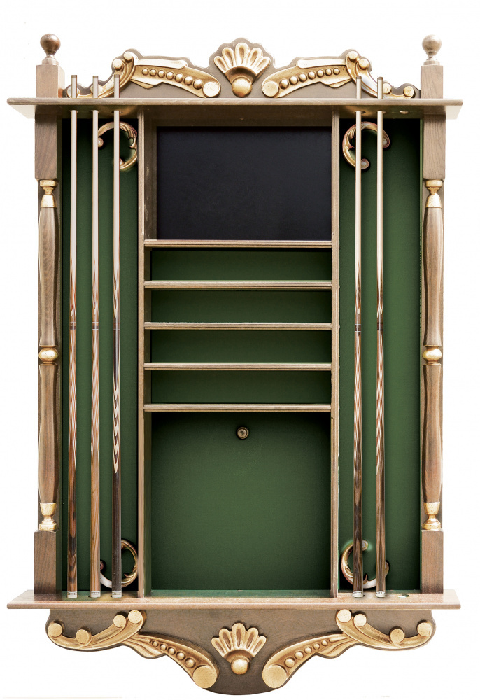 Модель настенная, предназначена для 6 киев, позволяет разместить треугольник, мелки, а также бильярдные шары. Материал массив ясеня / клен. Есть возможность выбрать цвет из палитры Фабрики «Старт»