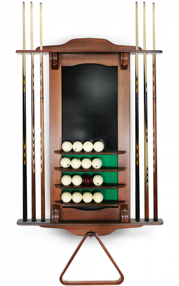 Модель настенная, предназначена для 6 киев, позволяет разместить треугольник, мелки, а также бильярдные шары. Материал сосна или массив ясеня. Есть возможность выбрать цвет из палитры Фабрики «Старт»