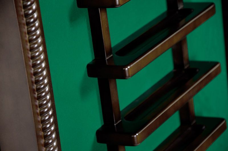Идеальное интерьерное решение для обладателей столов марки "Tower" - универсальная настенная киевница. Простота и лаконичность киевницы достигается за счет использования в ее дизайне классических форм и прямых линий. Изготовленная из твердых пород дерева,она прослужит Вам долгие годы. Киевница предназначена для вертикального хранения четырех киев и снабжена полкой для выкладки забитых в ходе партии шаров,что существенно облегчает ведение счета.