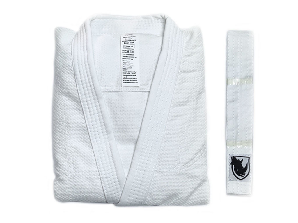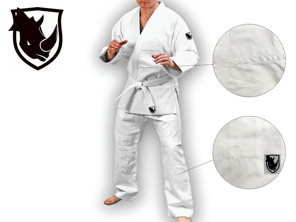 Кимоно из плетёной хлопковой ткани плотностью 360 - 380 г/м2 усилено двойными швами на плечах, рукавах и груди. Места, подверженные наиболее интенсивному воздействию (лацканы, колени, проймы, боковой разрез) усилены специальными вставками; внутренние швы обшиты тесьмой; цельнокроеный рукав. Брюки с усилением колена пошиты из хлопковой ткани, крепление на поясе — широкая вшитая резинка и шнур.