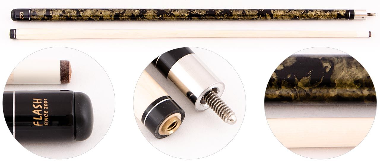 Надежность и долговечность скрутки обеспечивает внешнее металлическое кольцо. Оснащен резиновым бампером, который защищает турняк кия от механической деформации. В оформлении турника использована декоративная пленка с мраморной текстурой, делающая кий броским и эффектным.