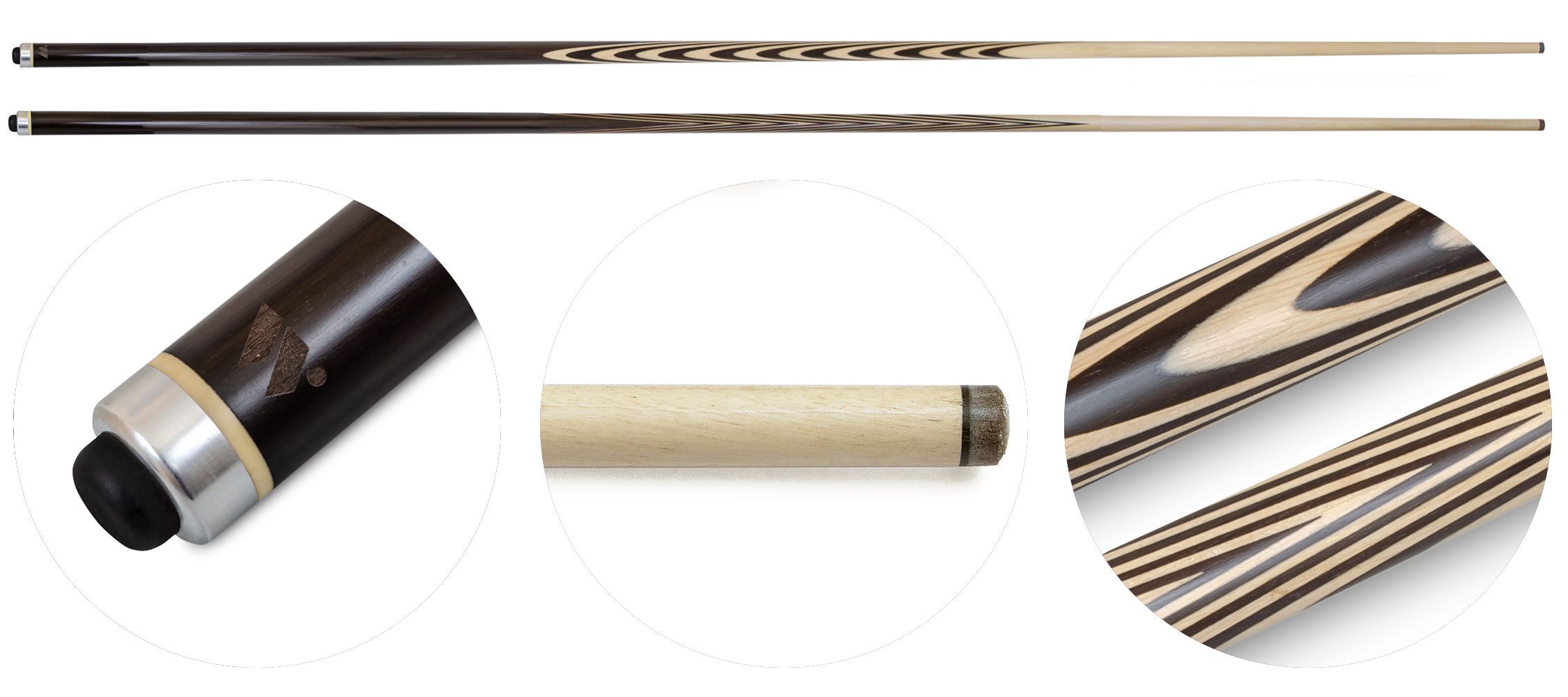 Цельный кий ручной работы изготовлен из самой твердой породы древесины, произрастающей в России — граба. Шафт сделан из белого граба, а турняк — из крашеного. Темно-коричневый, почти черный цвет получается в результате специальной химической обработки.