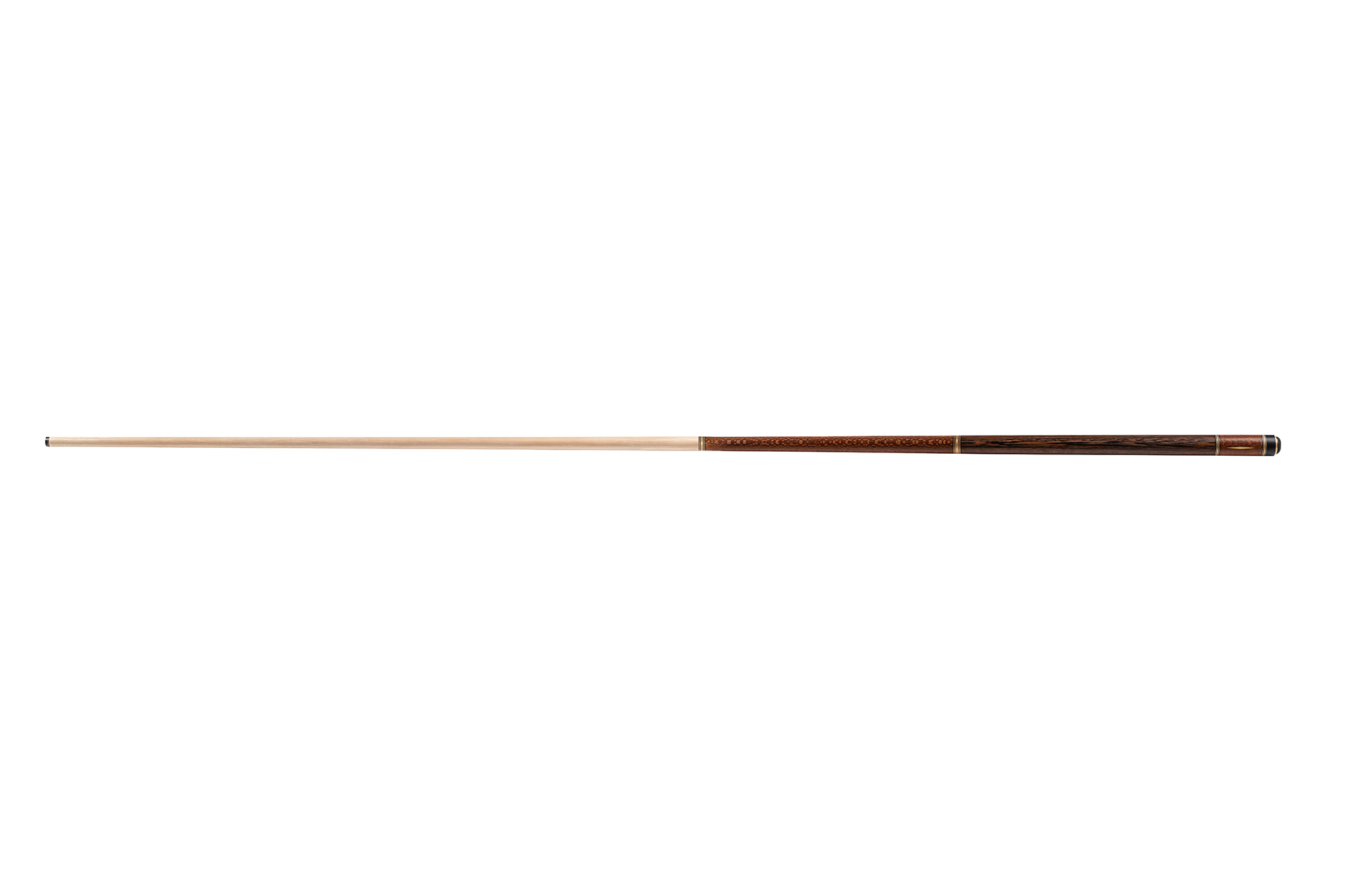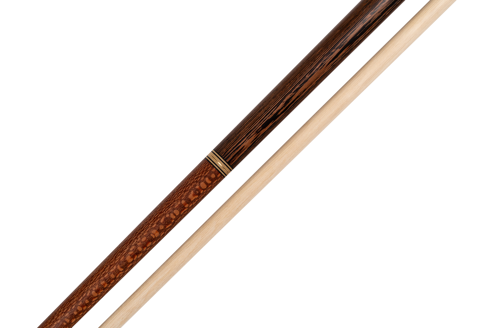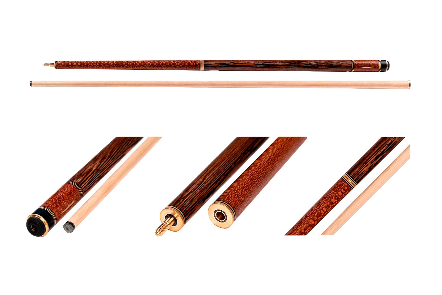 - Турняк: Представляет собой элегантную комбинацию двух экзотических пород. Шелковое дерево 15-тилетней выдержки с уникальной переливающейся текстурой придает кию изысканный внешний вид, а вставки из темного африканского венге создают стильный контраст. Декорирован инкрустацией из латуни.