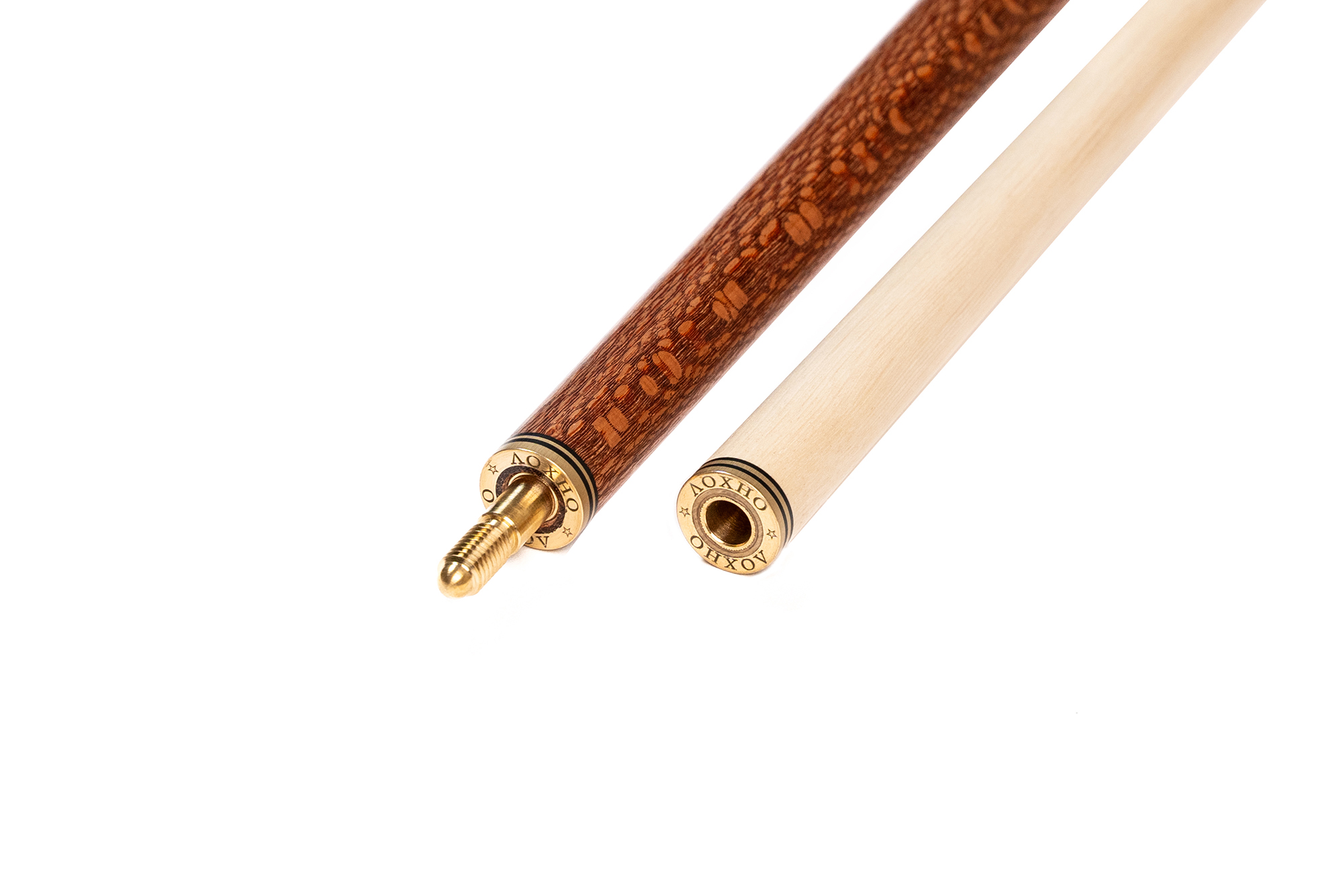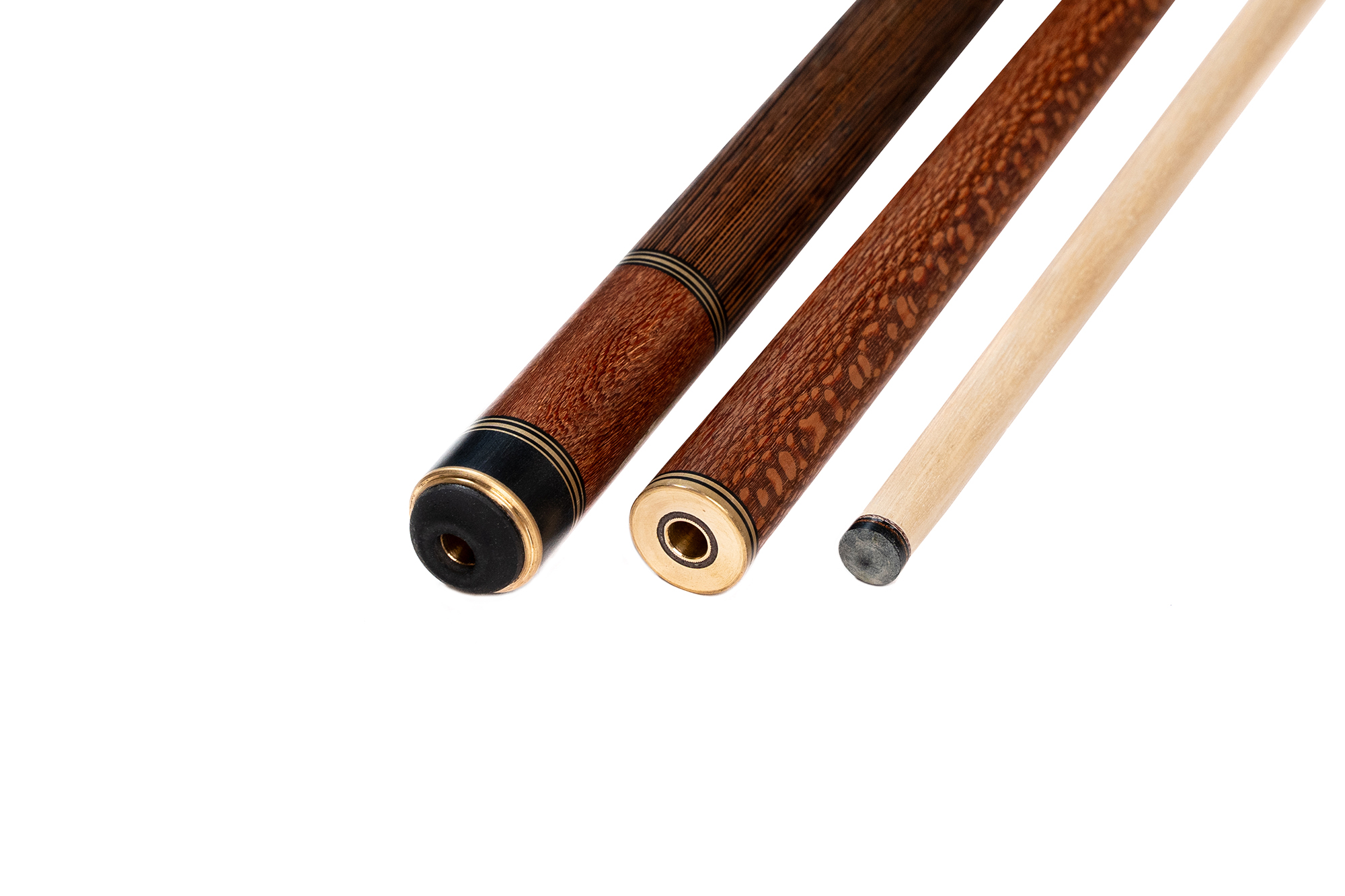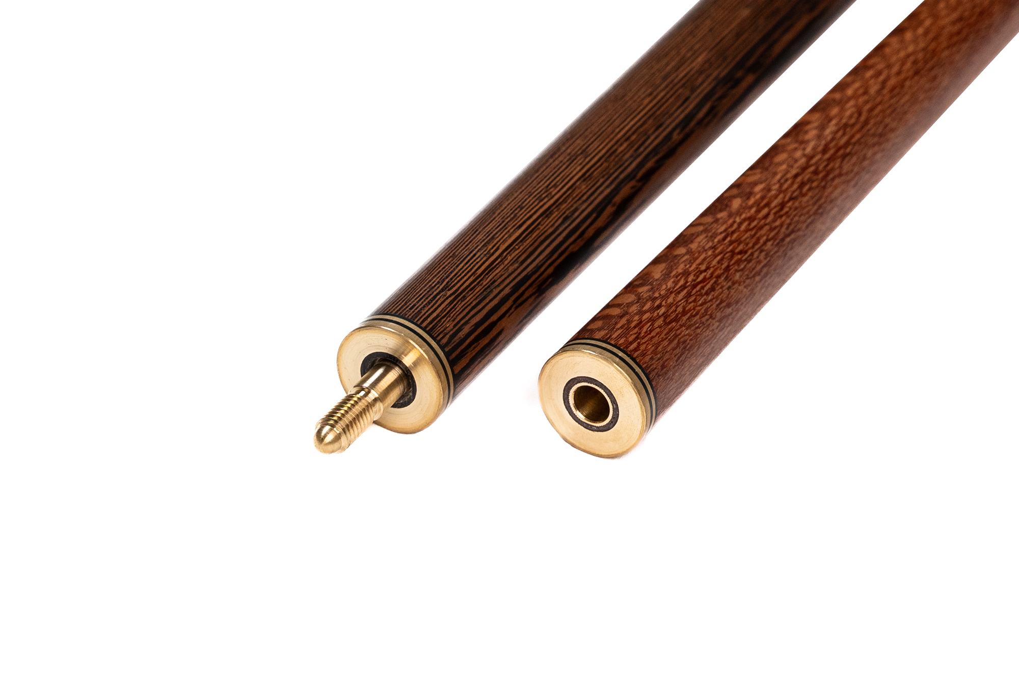 - Турняк: Представляет собой элегантную комбинацию двух экзотических пород. Шелковое дерево 15-тилетней выдержки с уникальной переливающейся текстурой придает кию изысканный внешний вид, а вставки из темного африканского венге создают стильный контраст. Декорирован инкрустацией из латуни.
