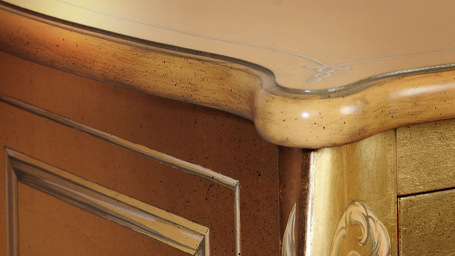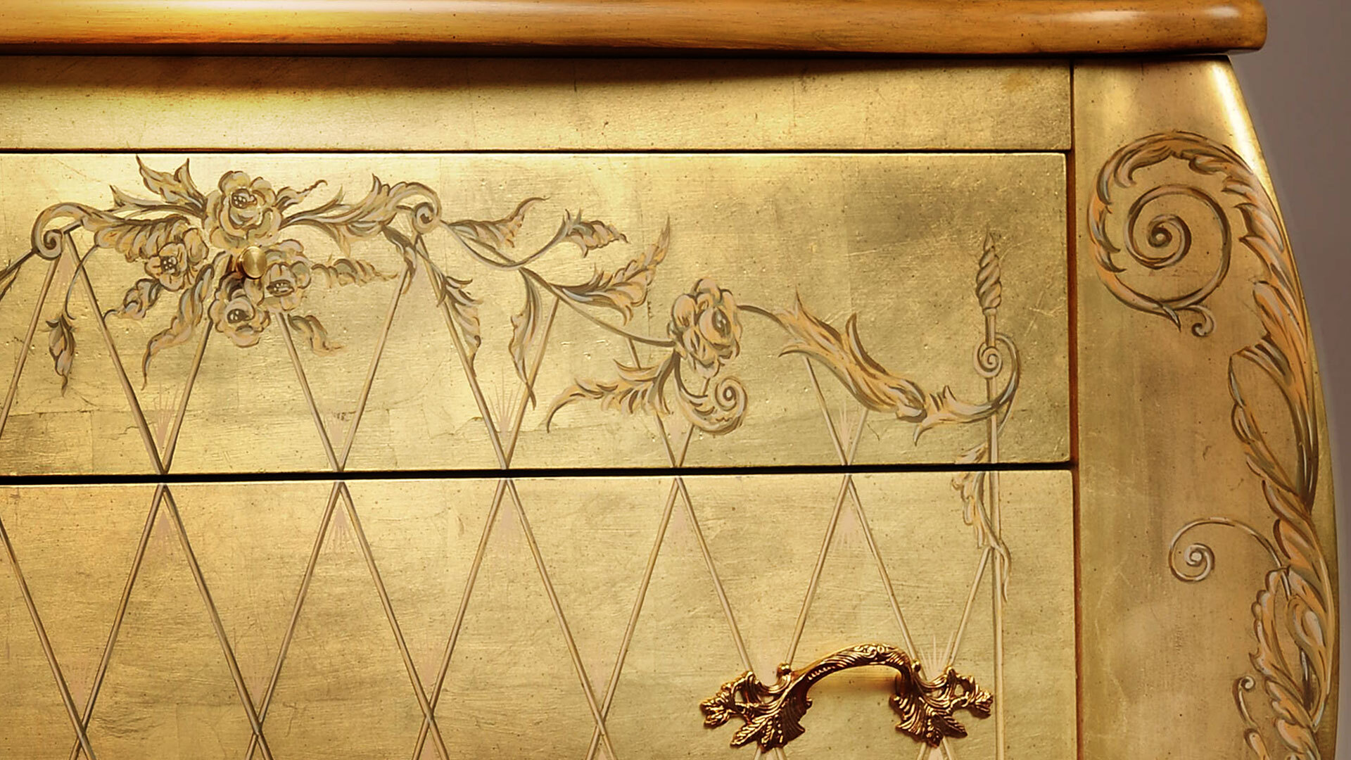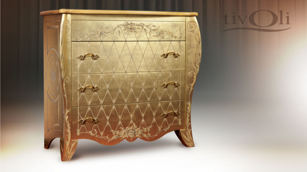 Комод в интерьере любой спальни является традиционным элементом, он никогда не выйдет из моды. Роскошный комод «Винтаж» особенный, с шармом, уникальный и неповторимый. Авторский дизайн конструкции, плавные формы и очертания, изящная фурнитура - все напоминает роскошь прошлых лет. В покрытии использовано золочение в 23 карата, многослойная ручная роспись минеральными красками. Выполнен из цельного массива ясеня.