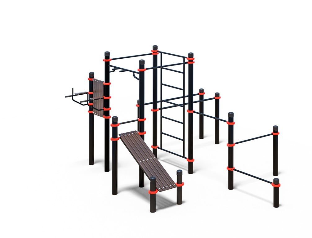 Комплекс «Богатырь» включает в себя все основные снаряды для занятий уличным фитнесом – воркаутом. В его состав входит 14 опорных столбов (круглые стальные трубы с толстыми стенками) высотой от 500 мм до 2600 мм, к которым посредством металлических хомутов прикрепляются такие элементы: