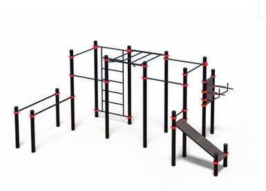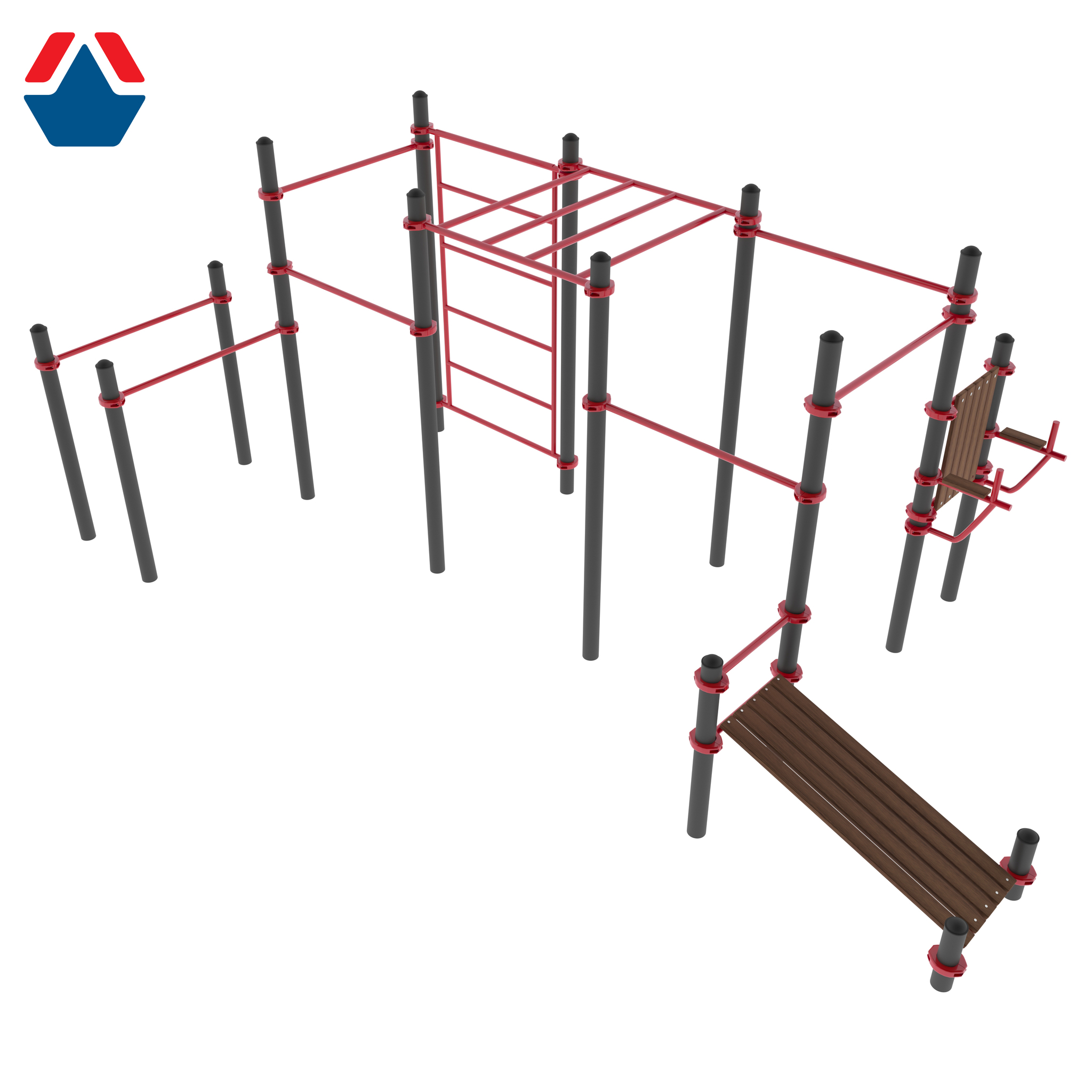 Комплекс включает в себя все основные снаряды для занятий уличным фитнесом – воркаутом. В его состав входит 15 опорных столбов (круглые стальные трубы с толстыми стенками и полусферическими заглушками), к которым посредством металлических хомутов прикрепляются такие элементы: