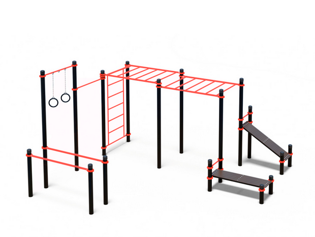 Основное преимущество гимнастических комплексов для воркаута заключается в том, что вы получаете сразу несколько снарядов для индивидуальных или даже групповых занятий. Они позволяют создать настоящую полосу препятствий. Данный комплекс состоит из турника для подтягивания длиной по 1200 мм, перекладины с гимнастическими кольцами, шведской стенки высотой 2200 мм, брусьев для отжиманий. Также в комплекте расположены две доски для пресса с уклоном и два классических рукохода.