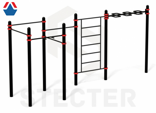 Еще один гимнастический комплекс, полностью соответствующий требованиям к оборудованию по сдаче государственных нормативов физической подготовки. Он включает в себя все необходимые снаряды для занятий воркаутом. К семи вертикальным несущим столбам высотой 2600 мм при помощи хомутов прикрепляются следующие тренажеры: