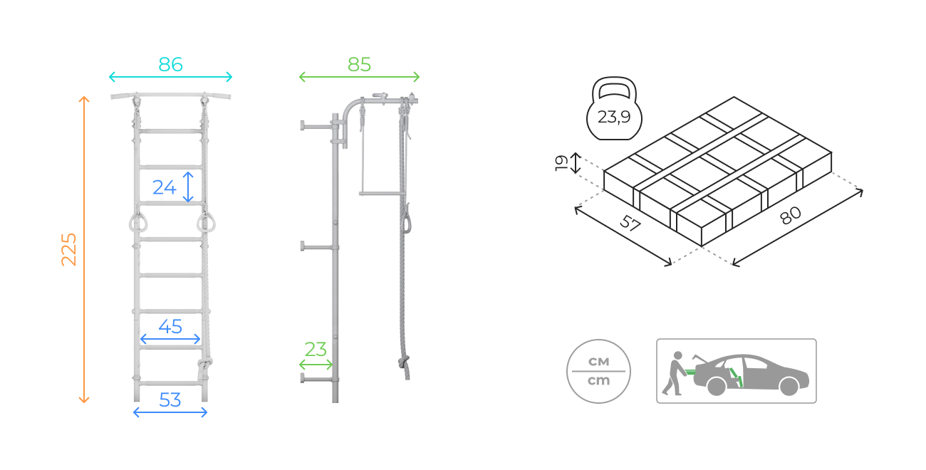 Компактная упаковка комплекса легко перевозится в легковом автомобиле. Габариты упаковки 57х80х19 см.