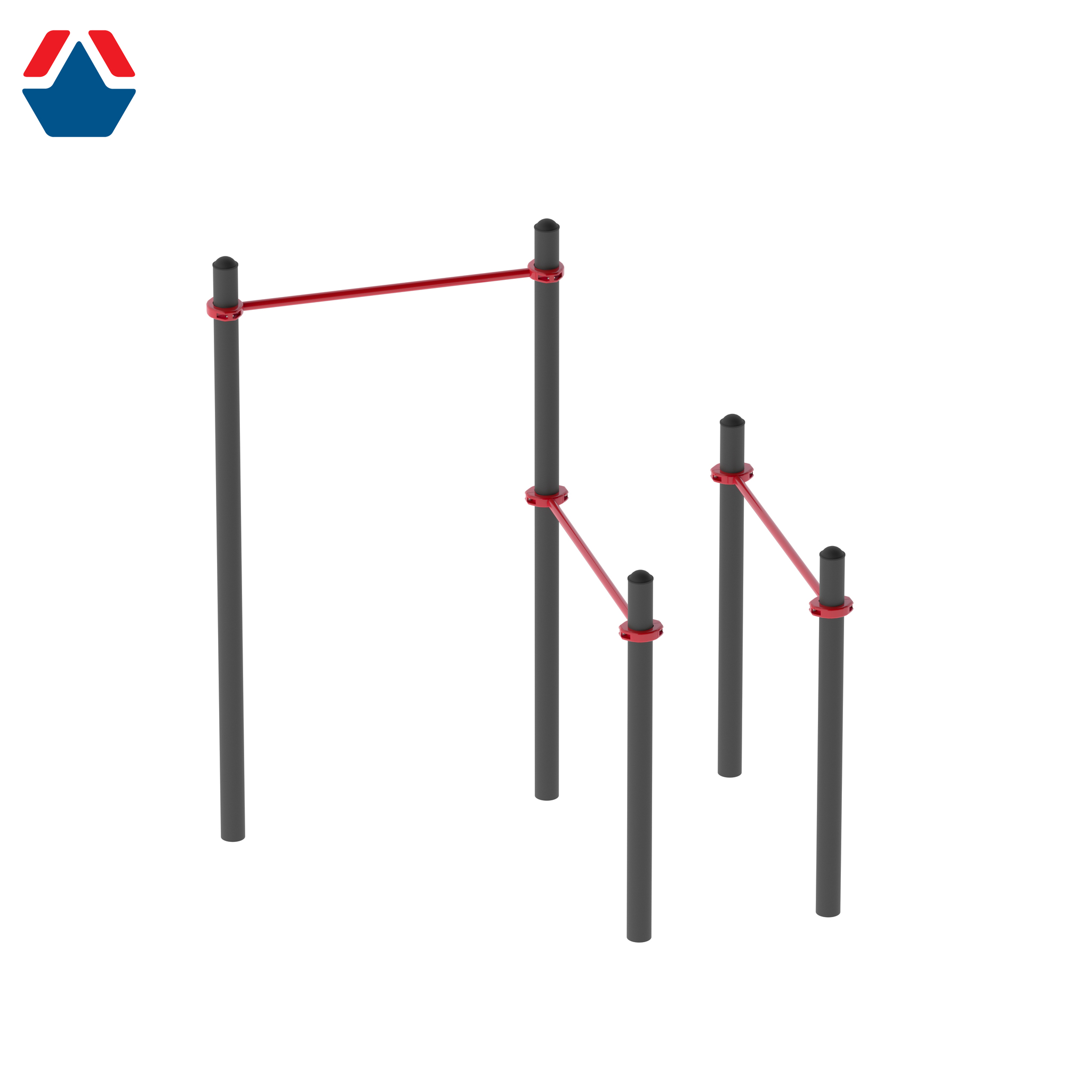 Дают возможность легко организовать как индивидуальные, так и групповые занятия воркаутом на спортивной площадке или в любом дворе. В качестве несущей конструкции используется 4 опорных столба диаметр 108*3 мм с полусферическими заглушками высотой 1400 миллиметров, между которыми на высоте 1200 мм параллельно друг другу закрепляются стальные жерди с рабочей поверхностью 1800 миллиметров. Диаметр жердей 48 мм. Они производятся из толстостенной трубы, которая обеспечивает повышенную устойчивость к нагрузке.