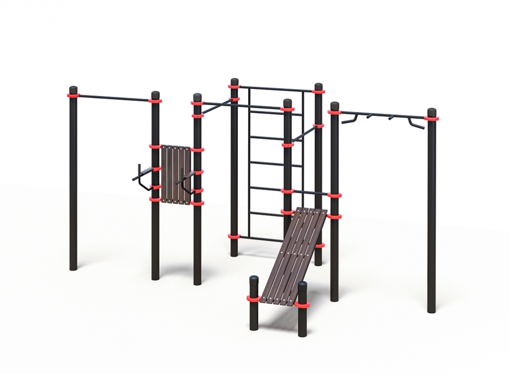 Комплекс «Здоровяк» включает в себя все основные снаряды для занятий уличным фитнесом – воркаутом. В его состав входит 10 опорных столбов (круглые стальные трубы с толстыми стенками), к которым посредством металлических хомутов прикрепляются такие элементы: