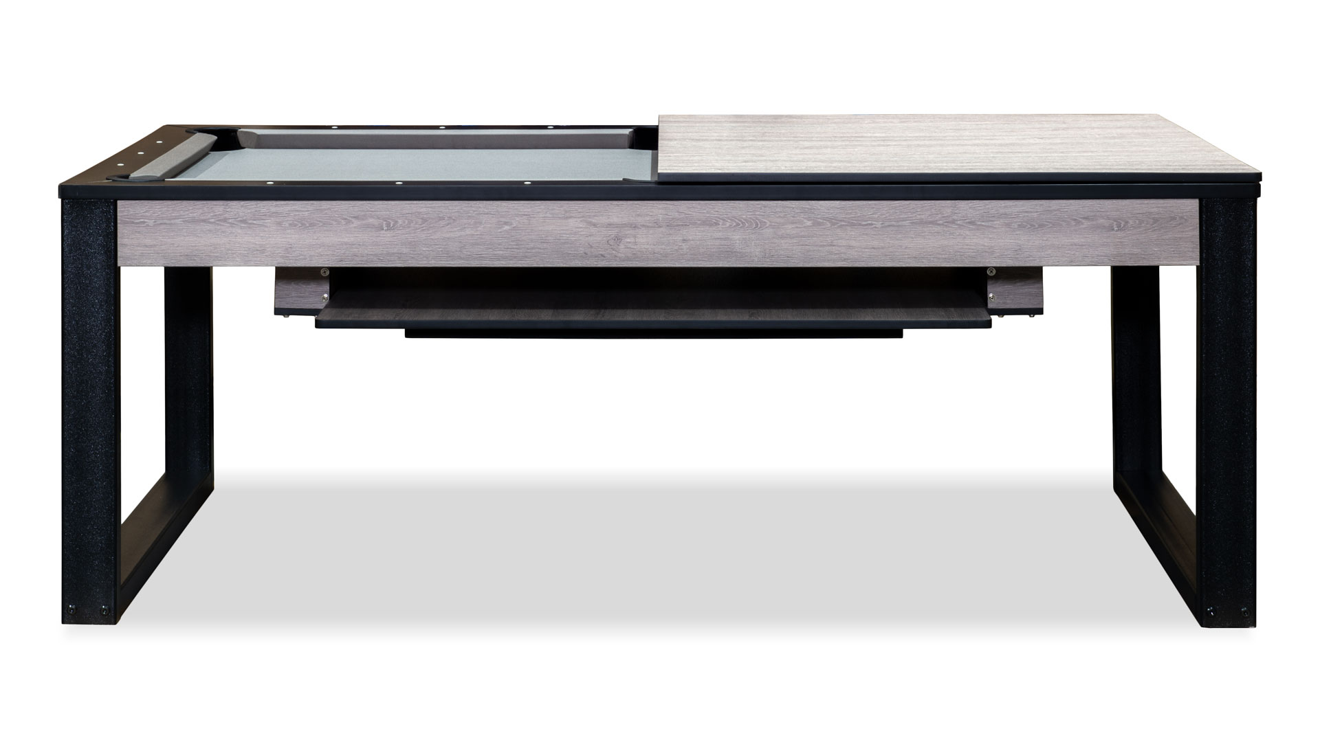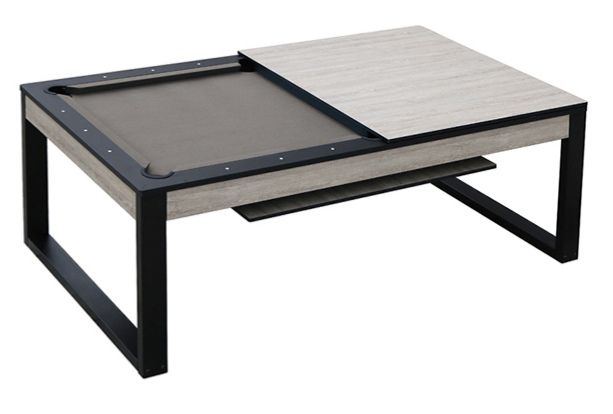 Благодаря простой конструкции обеденный стол на 4 персоны быстро превращается в бильярд «пул» 7ф. Для этого уберите составные части столешницы в нишу снизу — и можно начинать игру!