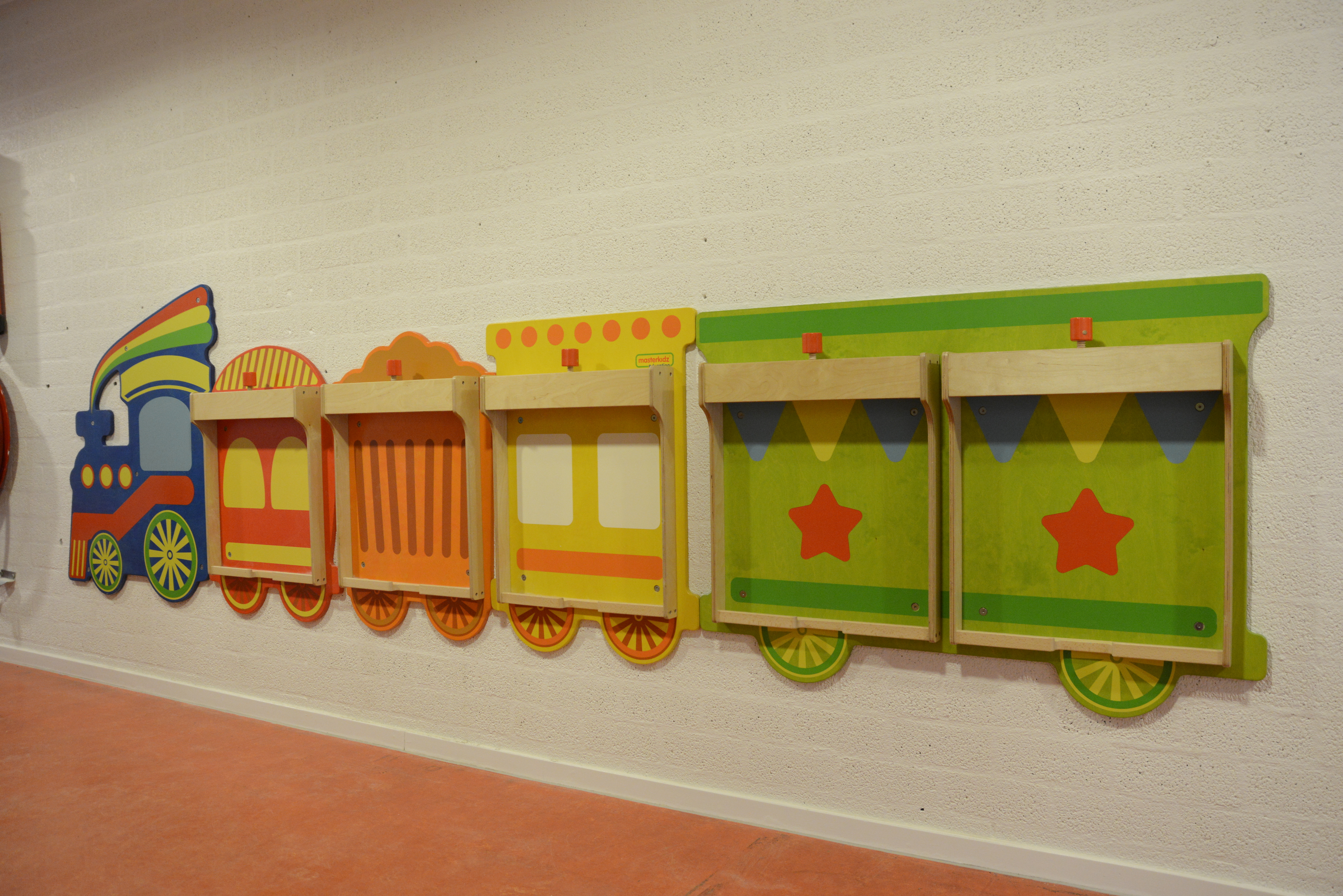 Комплект для крепления панелей в виде разноцветного поезда выполнен из березовой фанеры и бука, крепится к стене с помощью саморезов. Возможно установить до 5 образовательных панелей Masterkidz серии ME (размером 460х460мм). Учителя могут легко изменять элементы стены в соответствии с учебной тематимкой и займет это менее минуты. Панели удерживаются в рамках, в которые они вставляются, а затем закрепляются по верхнему краю с помощью вращающегося фиксатора.