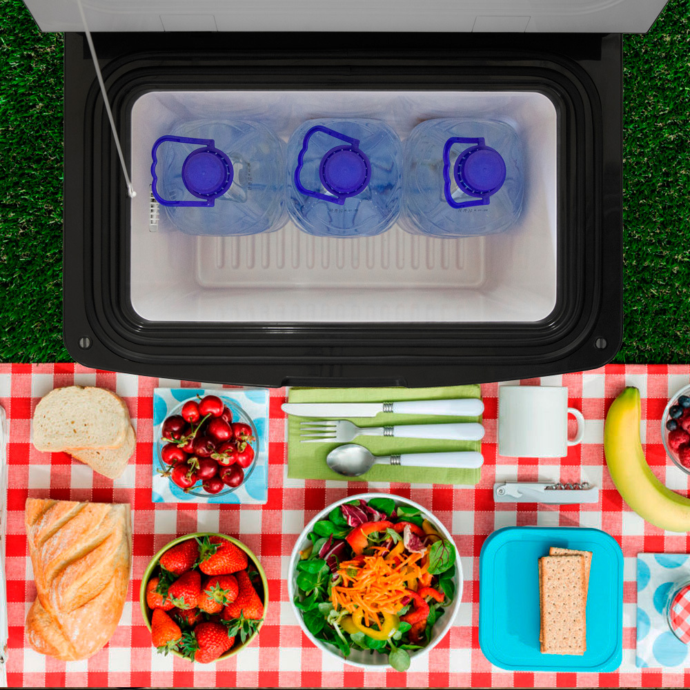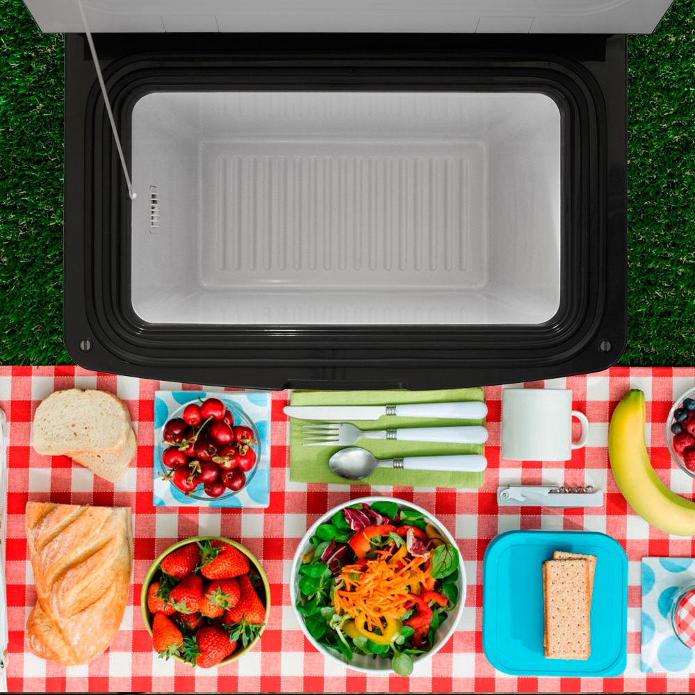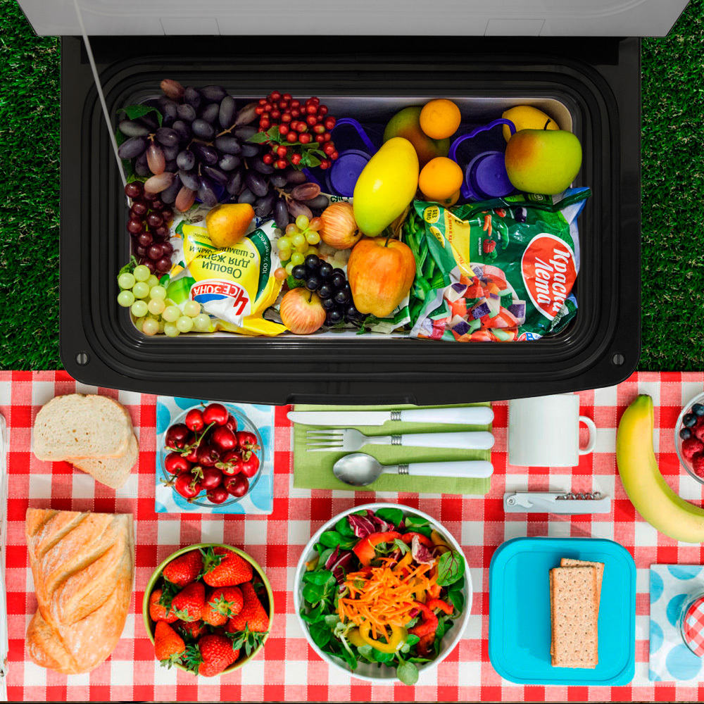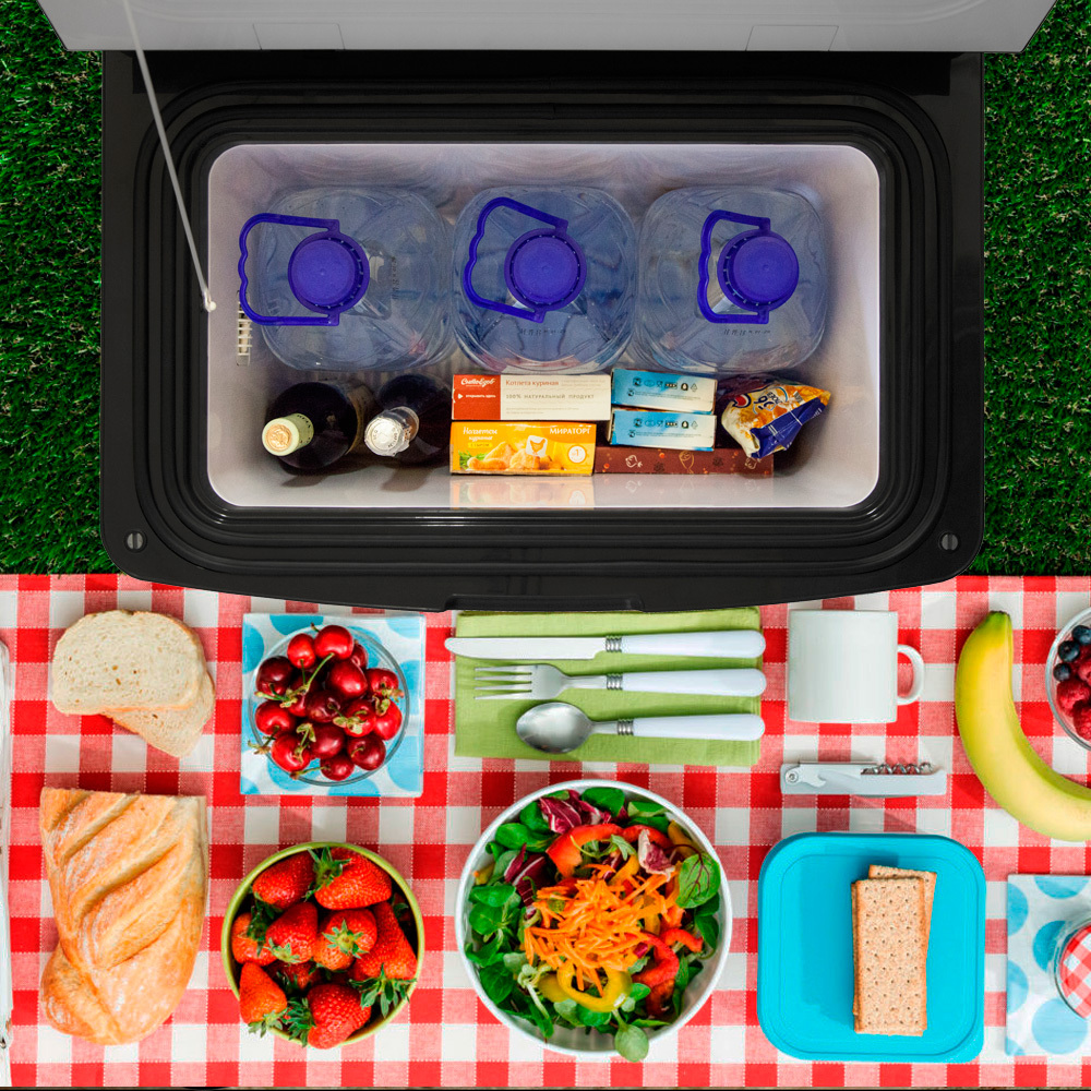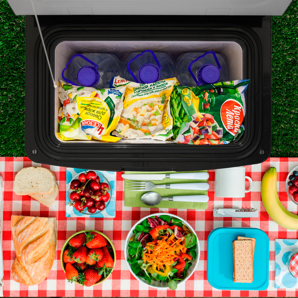 Диапазон работы автомобильного холодильника от +10 до -18 °С, берите с собой мороженое и освежающие напитки, салаты, фрукты и мясные изделия. Модель оснащена электронной панелью управления и дисплеем повышенной яркости. Крепкие ручки по бокам упростят перенос холодильника. Универсальный дизайн подойдёт для автомобилей любого модельного ряда.