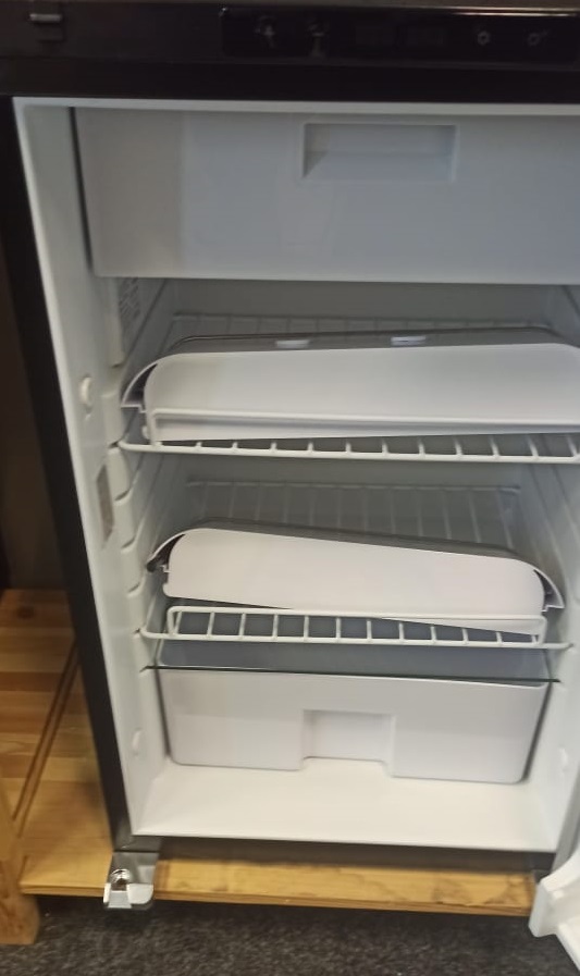 -Внутри есть съемный выдвижной ящик, полки, держатель для бутылок, отделения для яиц, сливная пробка
