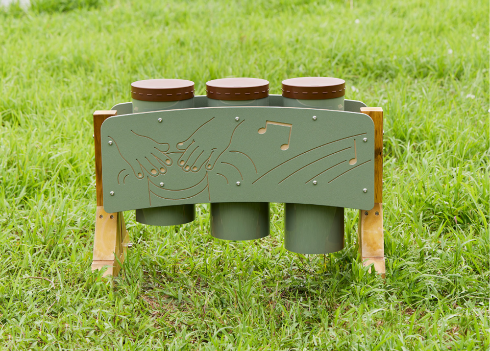 Три барабана установлены на атмосферостойкой сосновой стойке: мембраны расположены на удобной для детей высоте. На инструменте могут играть одновременно несколько ребят, пробуя координировать действия, — или один ребёнок в индивидуальном порядке.