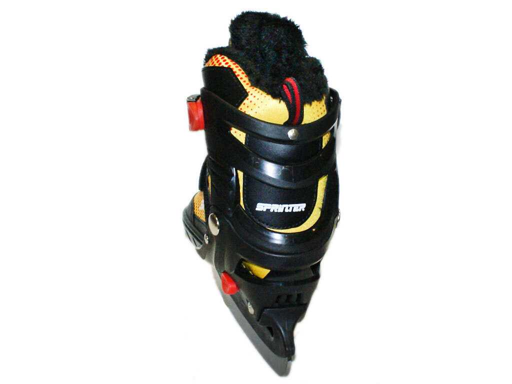 Раздвижные коньки с мехом SPRINTER. Такие коньки предназначены для любительского катания на льду. Верх ботинка водонепроницаемый из искусственной кожи и пластика. Подкладка из искусственного меха. Яркий и стильный дизайн не оставит коньки без внимания. В комплекте имеется удобная сумка на молнии для хранения и транспортировки коньков. Надежную фиксацию на ноге обеспечивают три типа застежек: шнуровка, липучка и пластиковая лямка с металлическим фиксатором.