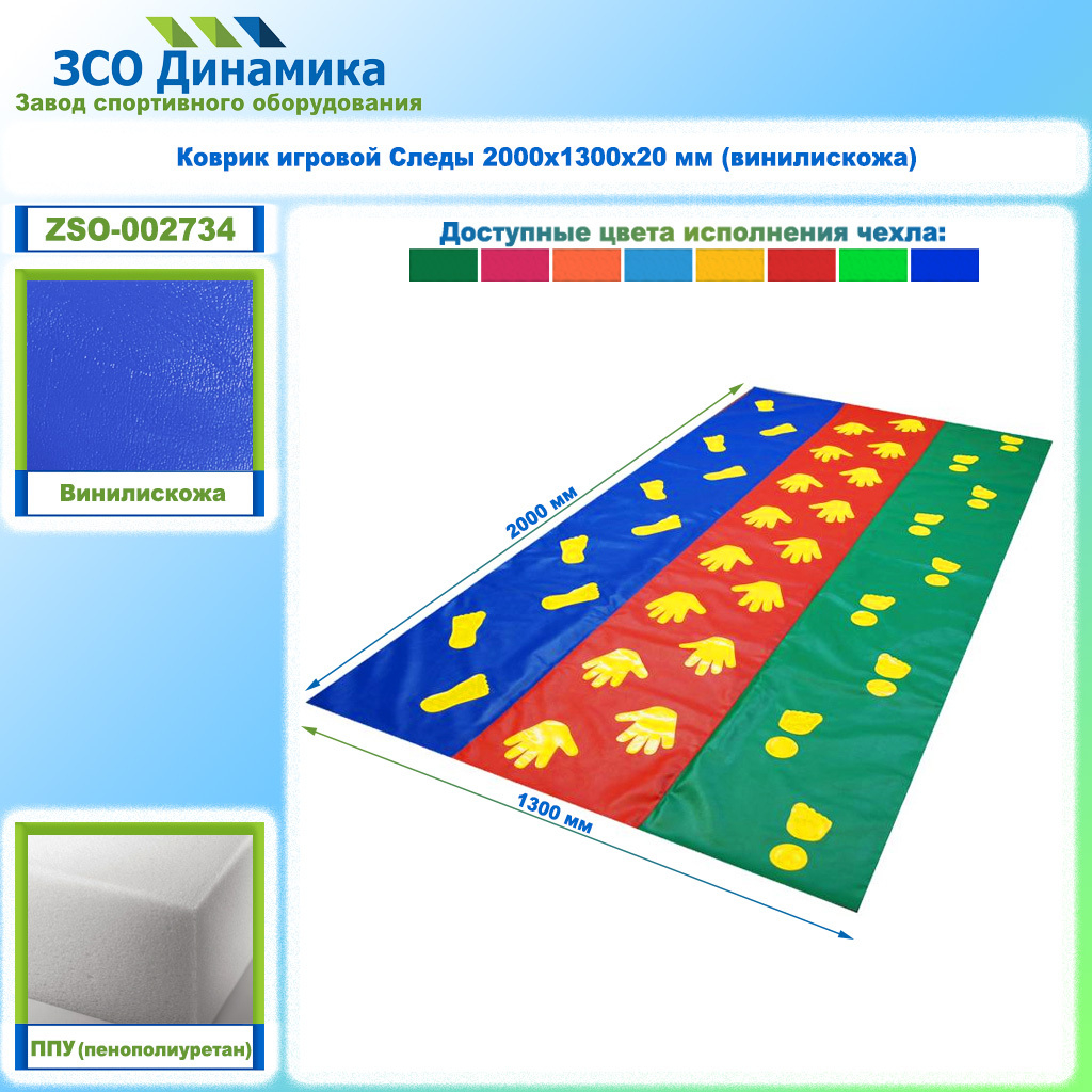 Игровой коврик Следы представляет собой мягкое изделие, состоящее из чехла сшитого из винилискожи и наполнителя - прочного поролона (ППУ - пенополиуретан плотностью 19,3 кг/м3). У мата имеется молния со скрытым замкам для замены наполнителя. Состоит из трехцветного полотна с нанесенными следами - ладошки-пяточки-носочки