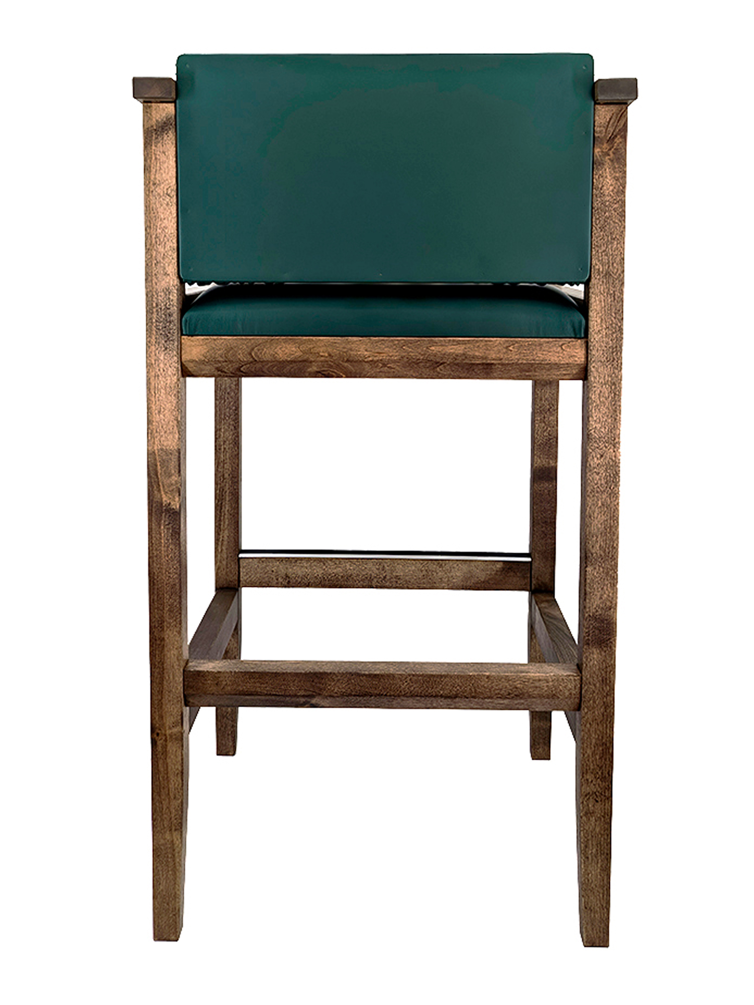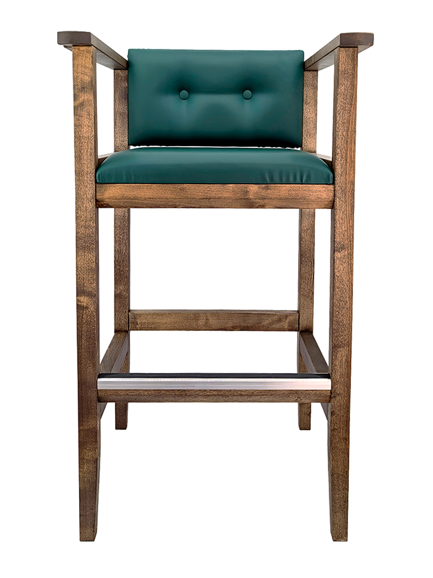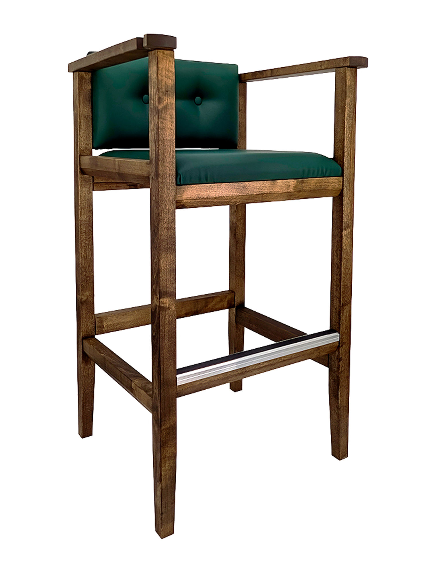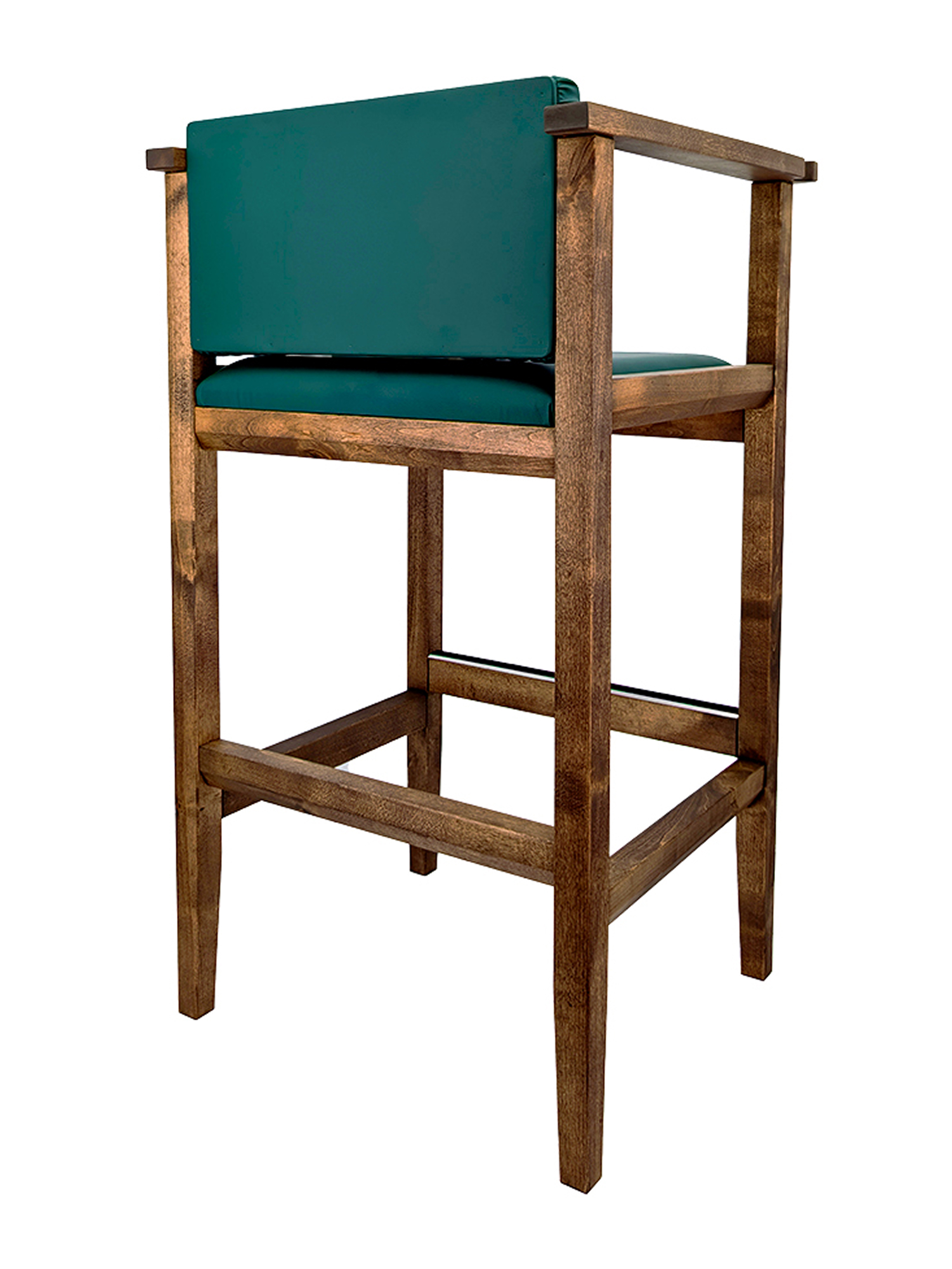 Бильярдное кресло из массива березы, выполненное в коричневом цвете. Модель отличается высокой конструкцией, сравнимой с барным стулом, и оснащена удобной подставкой для ног, обеспечивающей устойчивость. Сиденье и спинка имеют толстую-мягкую обивку, выполненную из прочной искусственной кожи насыщенного изумрудно-зеленого оттенка.