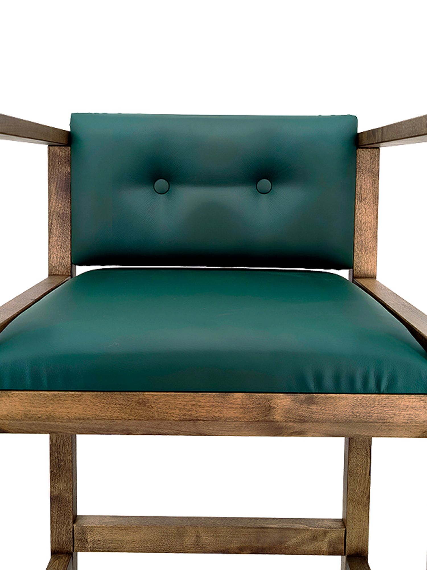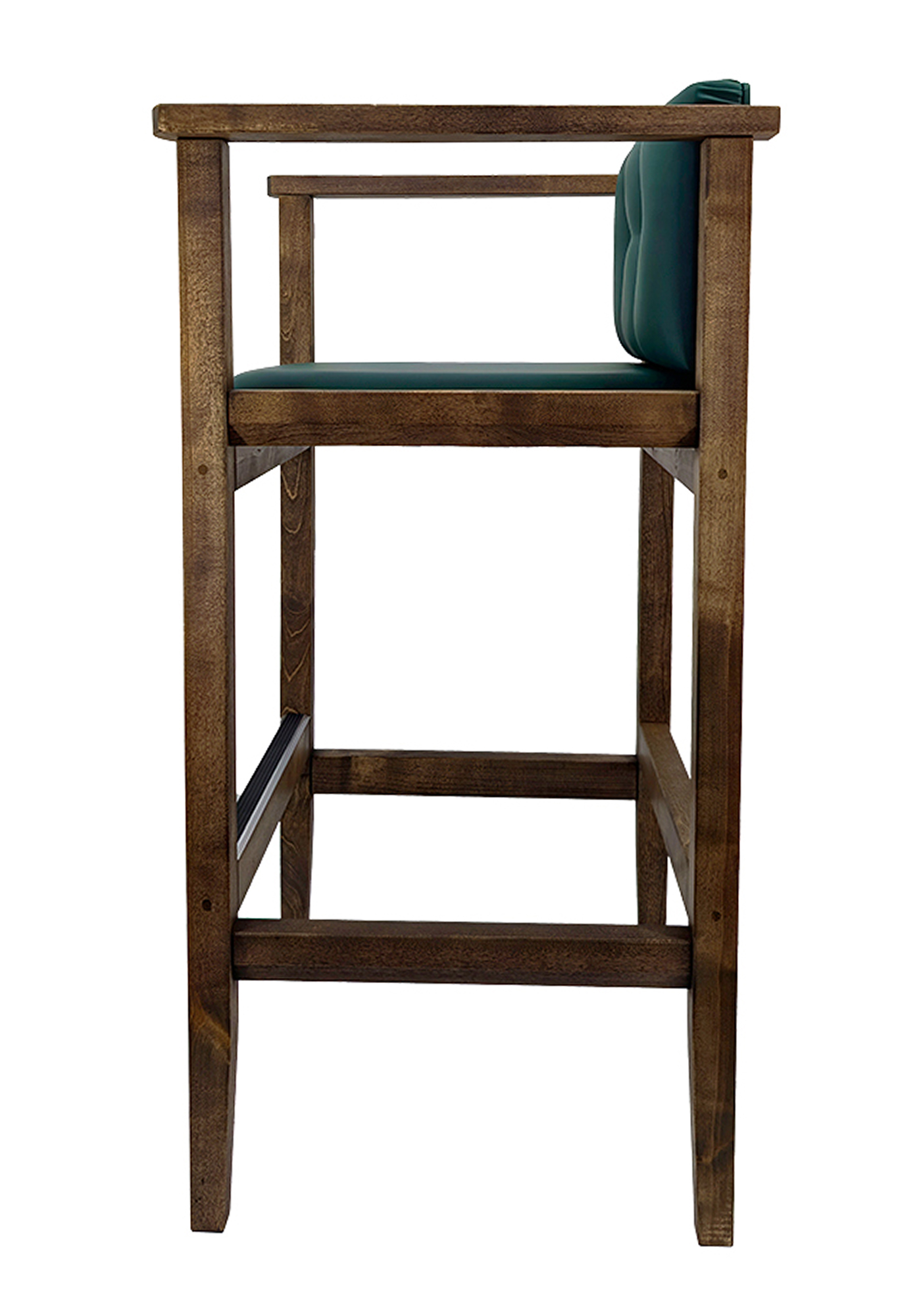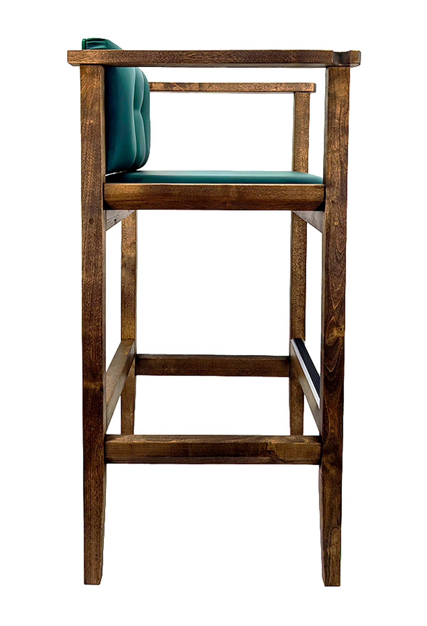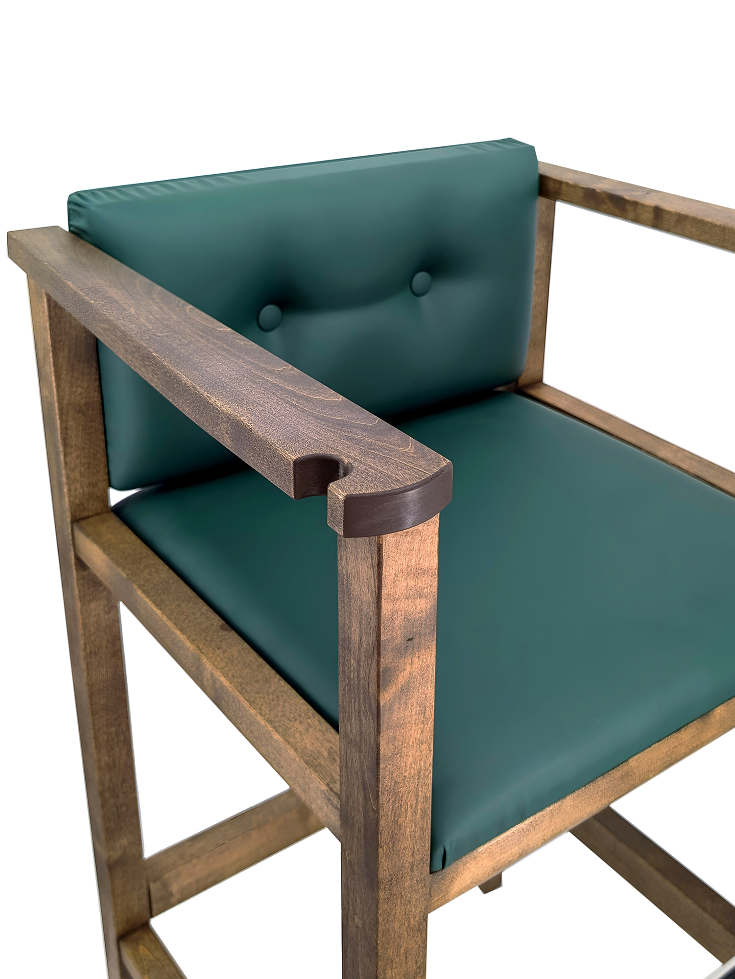 Бильярдное кресло из массива березы, выполненное в коричневом цвете. Модель отличается высокой конструкцией, сравнимой с барным стулом, и оснащена удобной подставкой для ног, обеспечивающей устойчивость. Сиденье и спинка имеют толстую-мягкую обивку, выполненную из прочной искусственной кожи насыщенного изумрудно-зеленого оттенка.