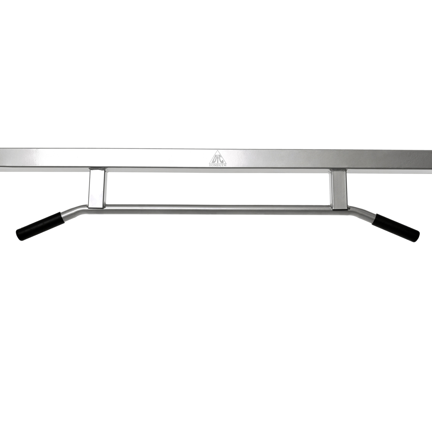 Турник с нескользящими ручками, входящий в комплектацию, выдерживает вес до 100 кг. Положение рук широким хватом хорошо укрепляет спину, руки и плечевой пояс.