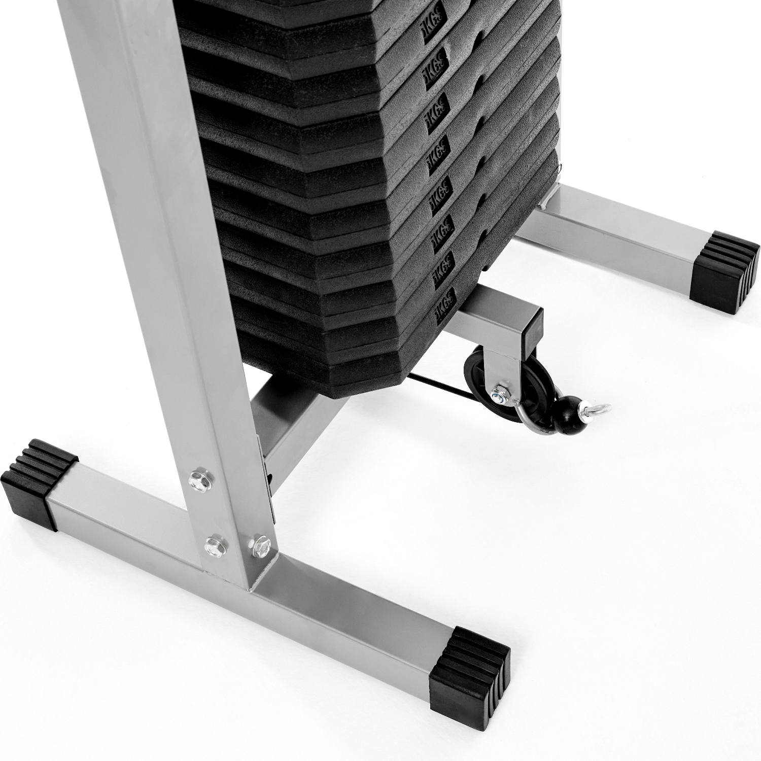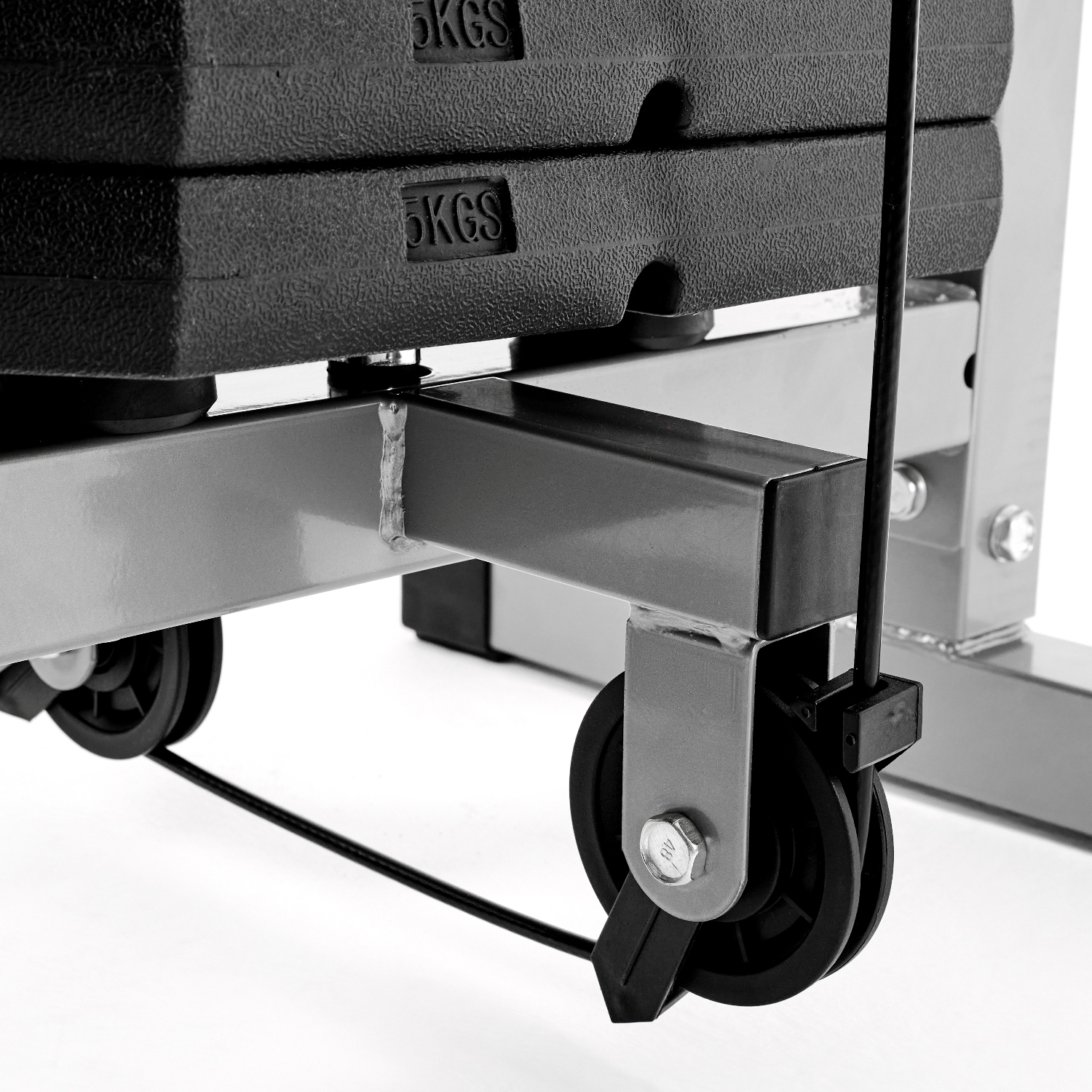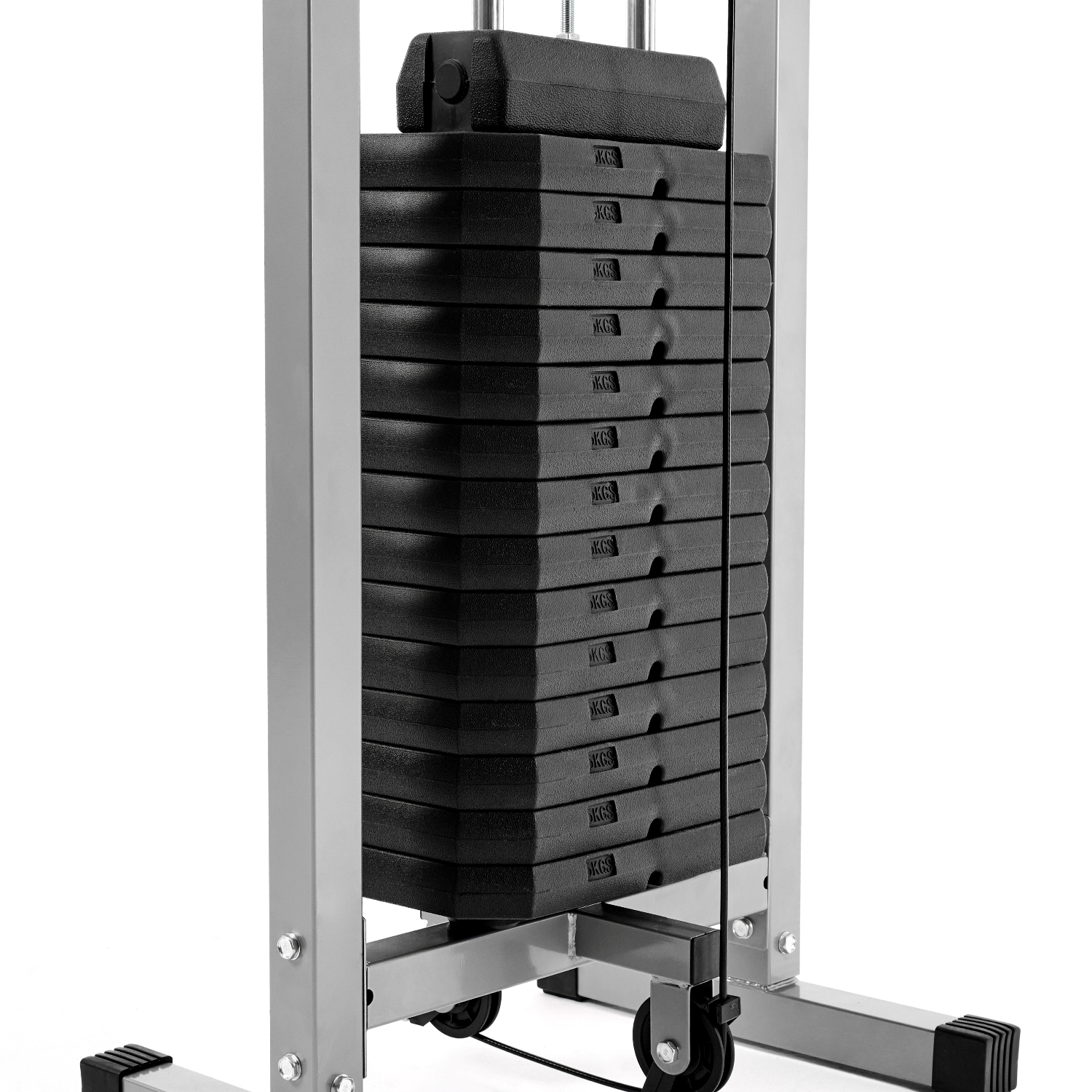 В комплект входит турник для подтягиваний, который позволяет выполнять упражнения широким хватом. В качестве нагрузки используются встроенные стеки общим весом 150 кг (2 по 75 кг).