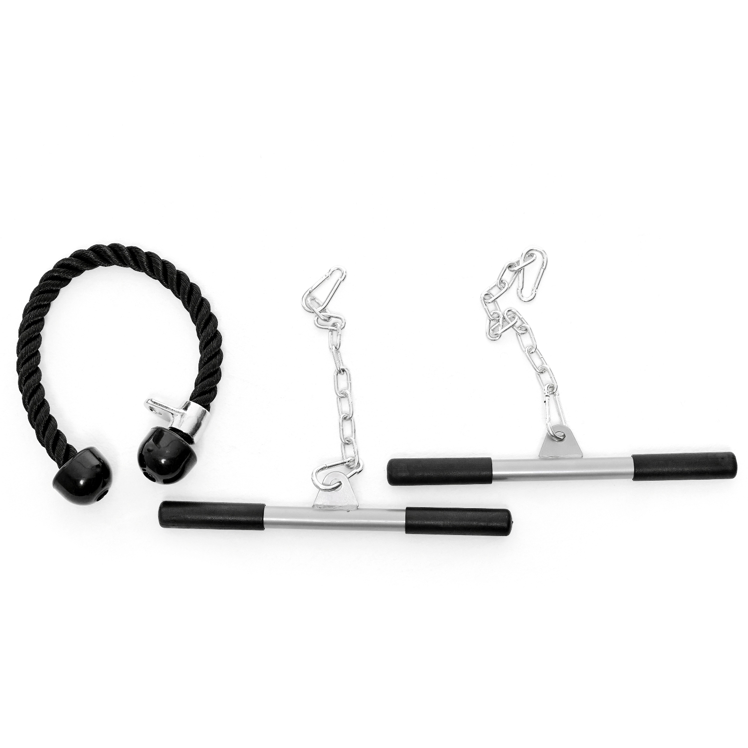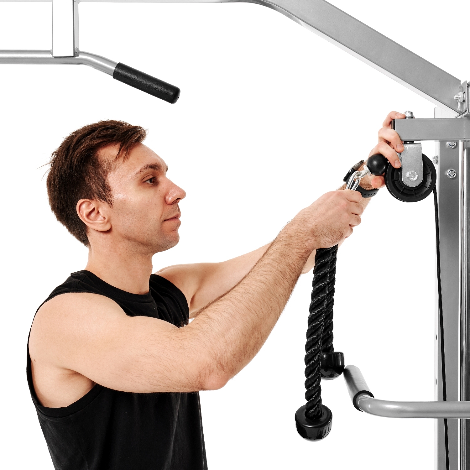 В комплектацию входит канат для упражнений на трицепс и бицепс (сгибания, разгибания рук), мышцы плеч и кора (упражнение «священник»). Он крепится к регулируемой по высоте каретке.